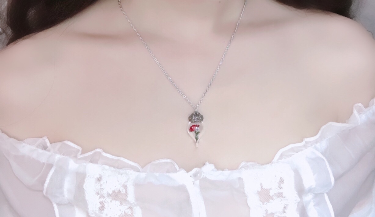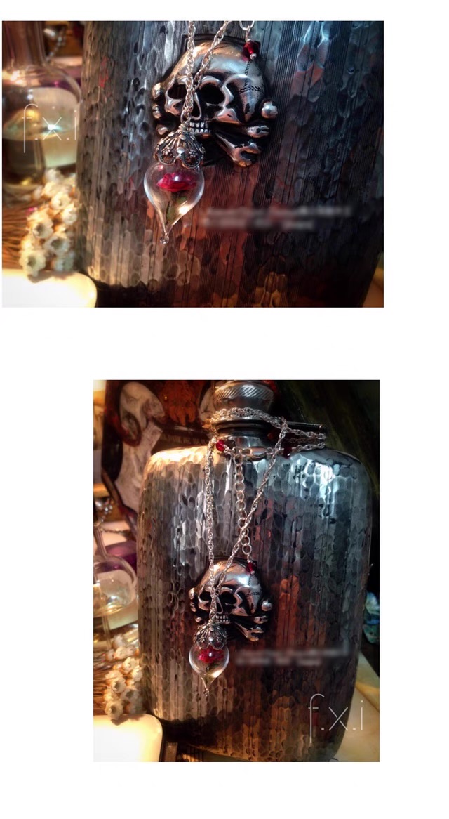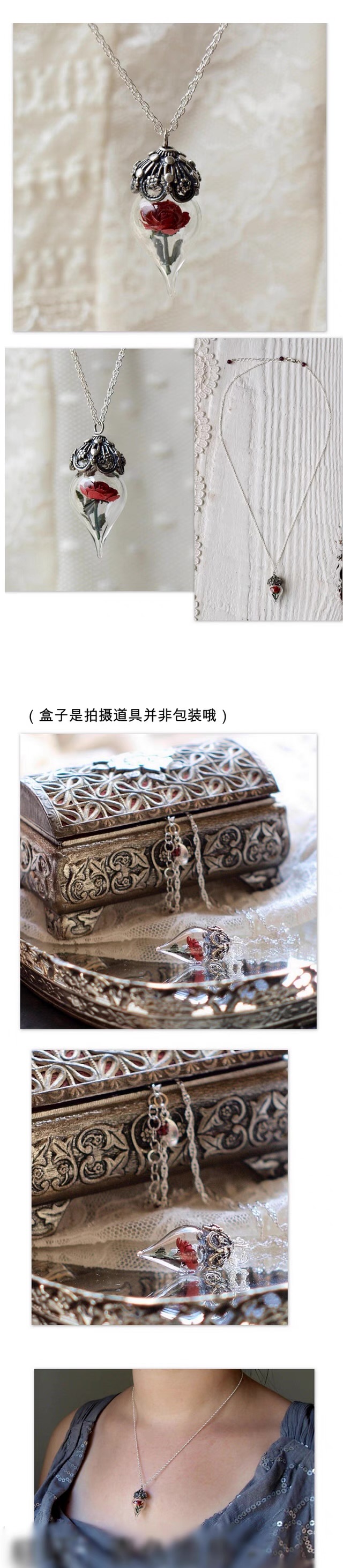 微型玫瑰花,使用档案纸手工制作而成(无酸耐分解,岁月流逝不易变黄变旧); 同样是手工制作的小玻璃瓶(手工制作玻璃瓶,可能带有微小气泡或划痕,不属质量问题),玻璃为实验室用材质,比普通玻璃牢固,但毕竟是玻璃,小心爱护哦。浪漫而复古的维多利亚风雕花纯银盖子,纯银绳链/龙虾扣/延长链(金属部分均为纯银材质),链子上还带有美丽高雅的石榴石点缀。