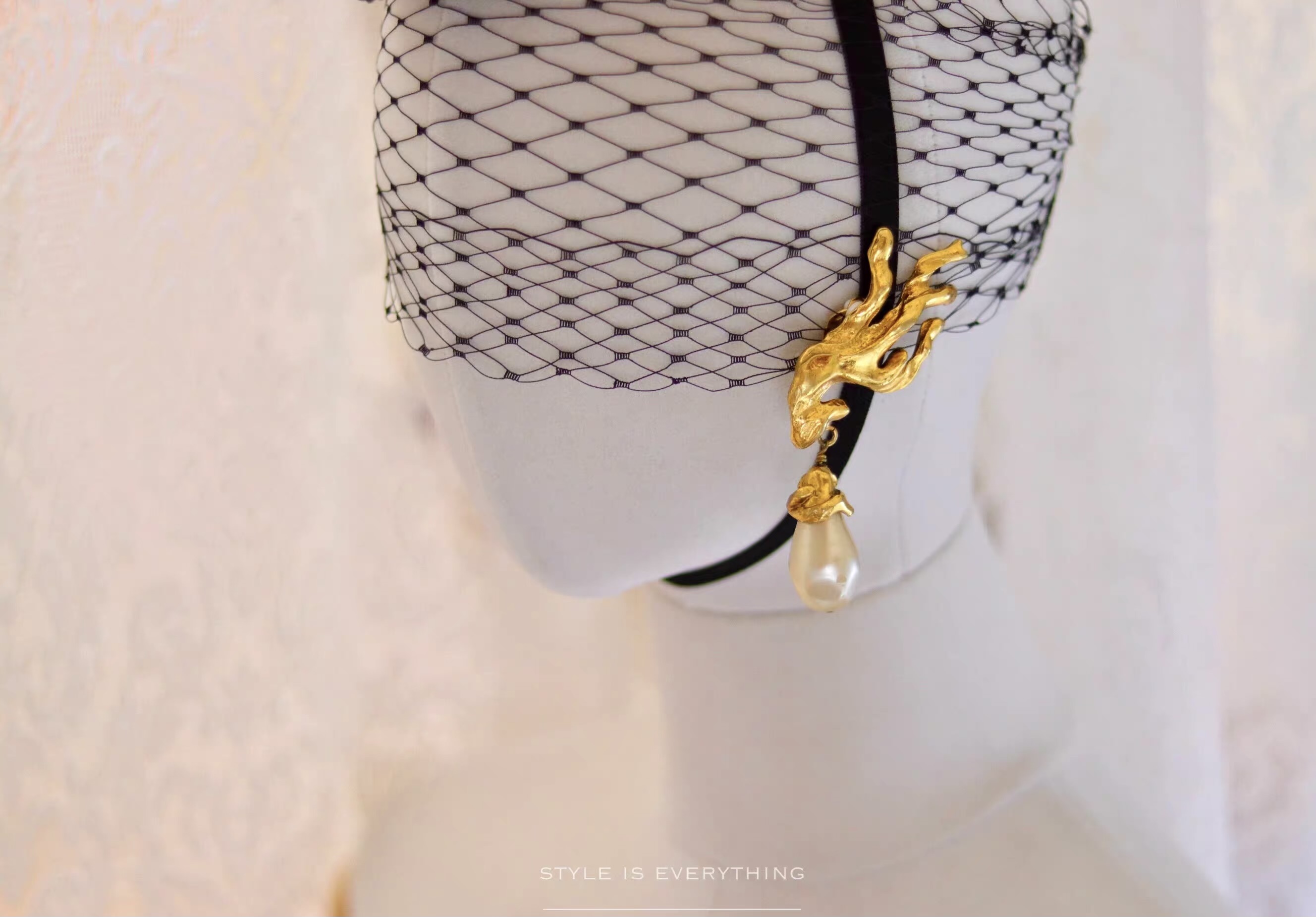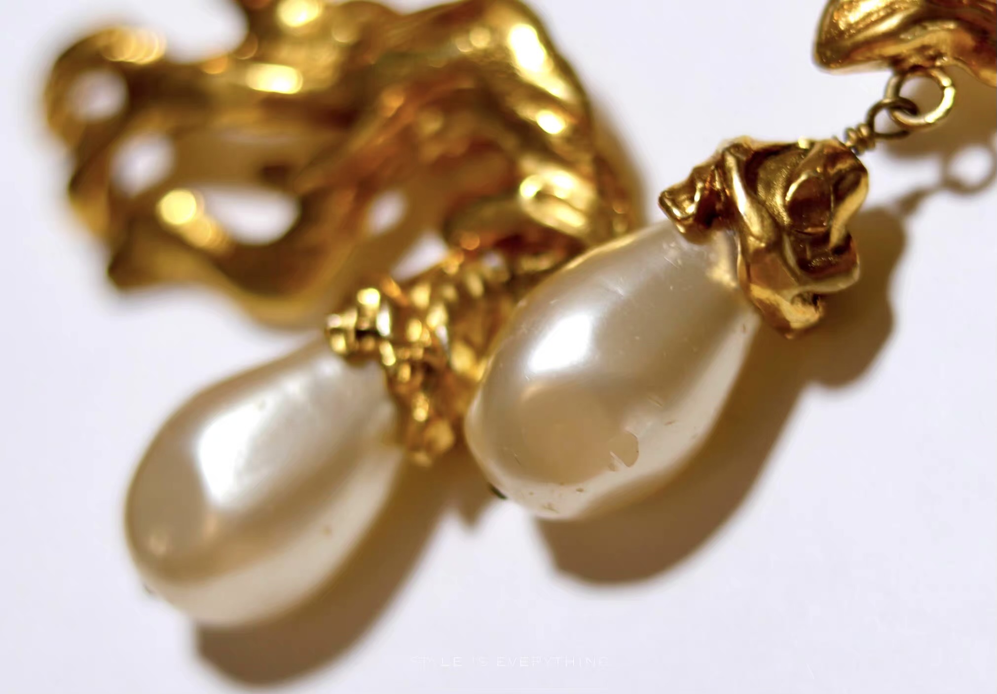 精灵树枝·美人鱼珊瑚·巴洛克珍珠泪滴·大耳环; 1980年代CL;镀金 / 琉璃珍珠,长约10CM,成色如图:好 – 珍珠微瑕;自然主义
