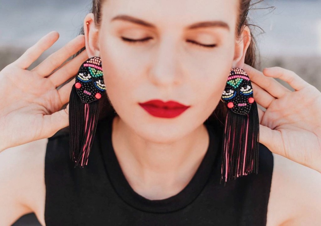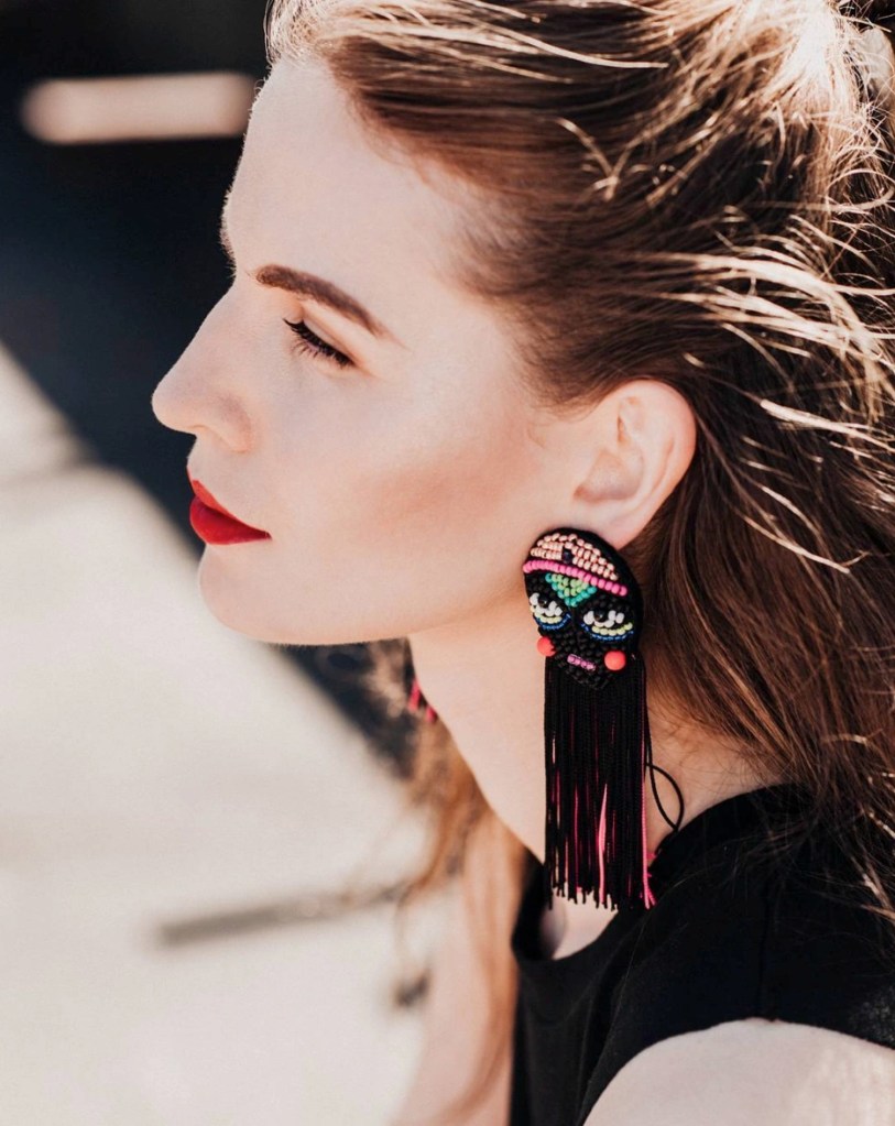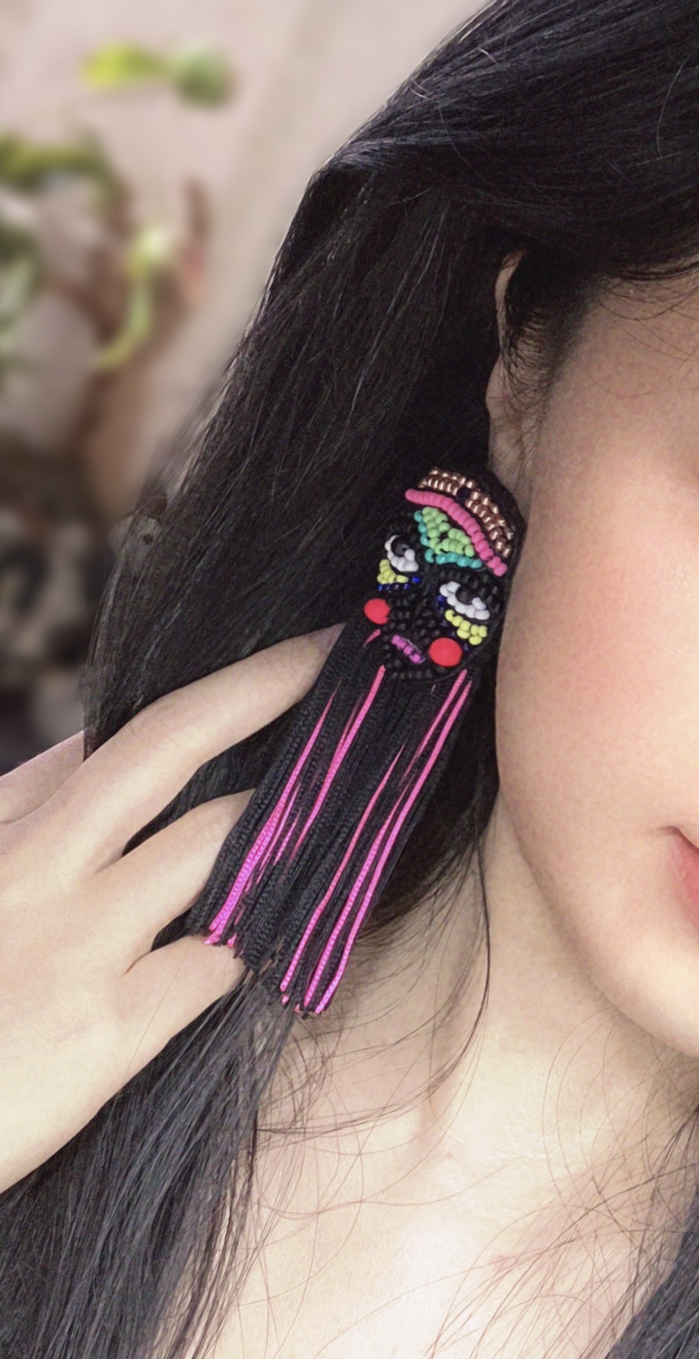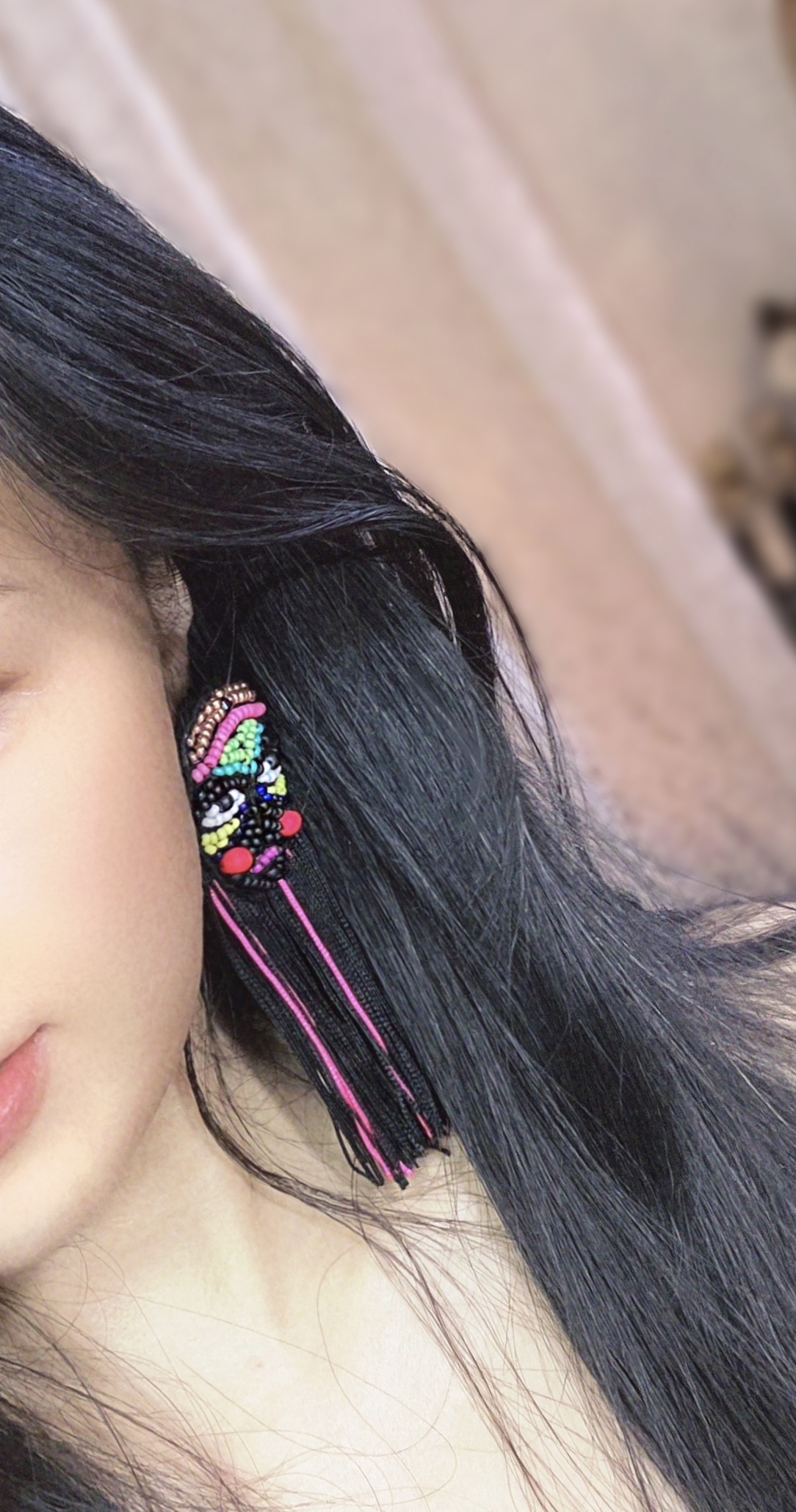 ①.「脸谱娃娃」世界游乐场;酷黑霓虹·珠饰刺绣流苏耳环;Latvia拉脱维亚手艺人MalvineLv;日本米珠/羊毛毡/流苏/银色合金耳针(不含镍,不易致敏);面具约5.5厘米X4厘米,流苏约8厘米长;绝版