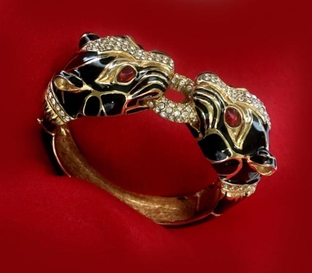 经典黑豹GRIPOIX红宝石·古典主义·铰链手镯;70年代CINER收藏级;莱茵石/镀金/黑珐琅彩