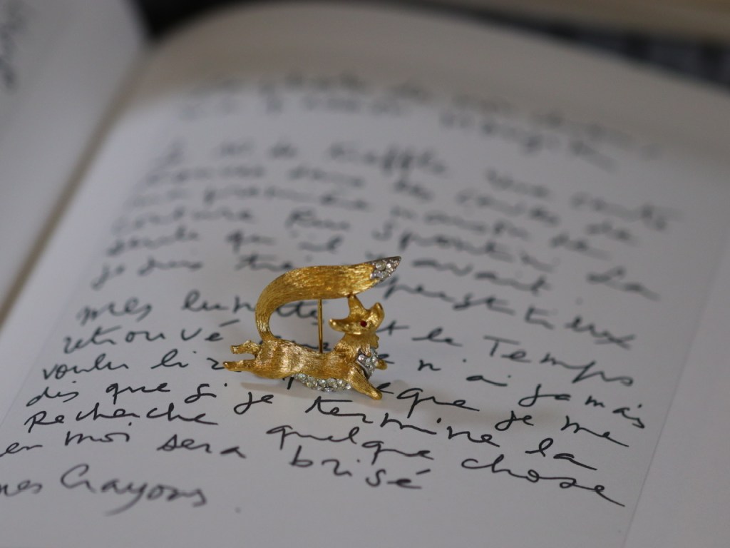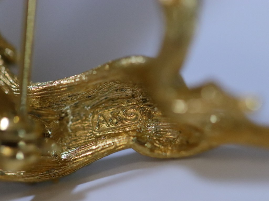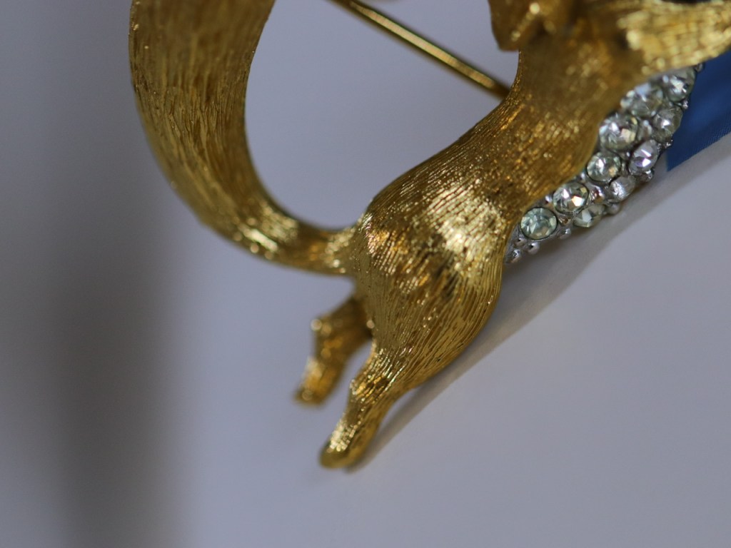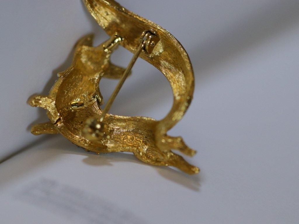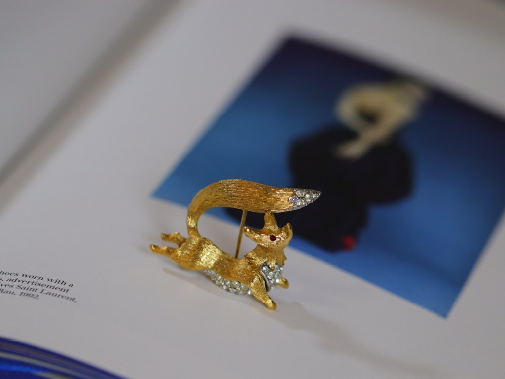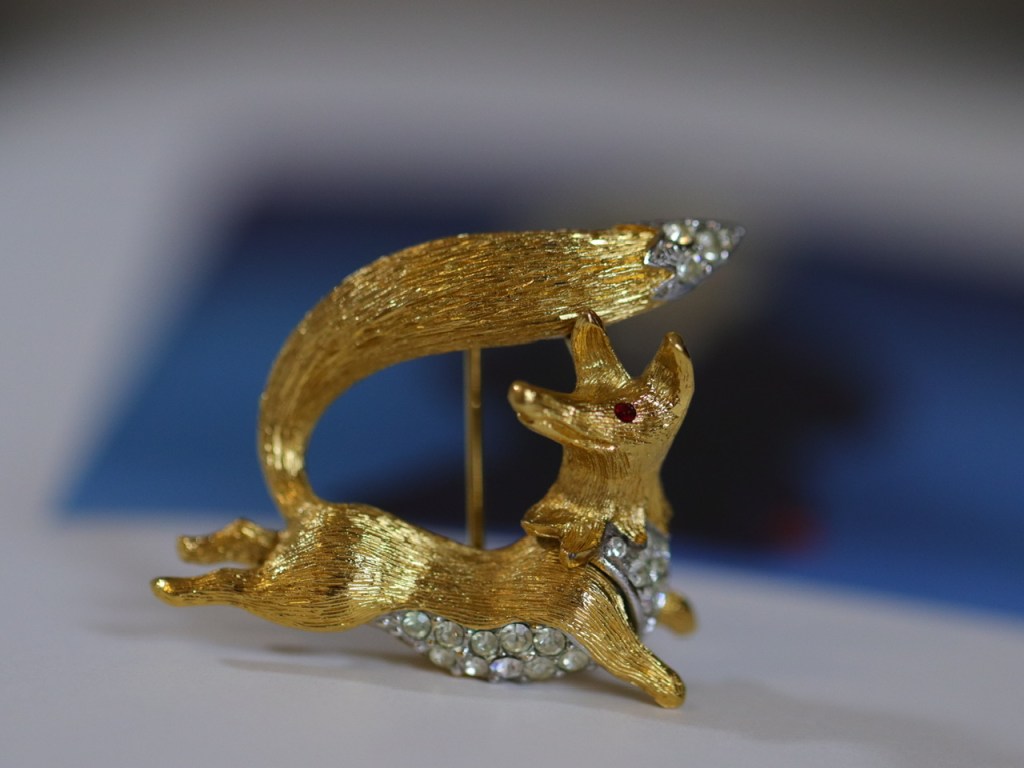 ①.「欢跃的小狐狸」自然主义动物主题小胸针;复古铰链式组合设计;70s东德水钻镀14k金纹理金梳质感;库存品,近乎全新