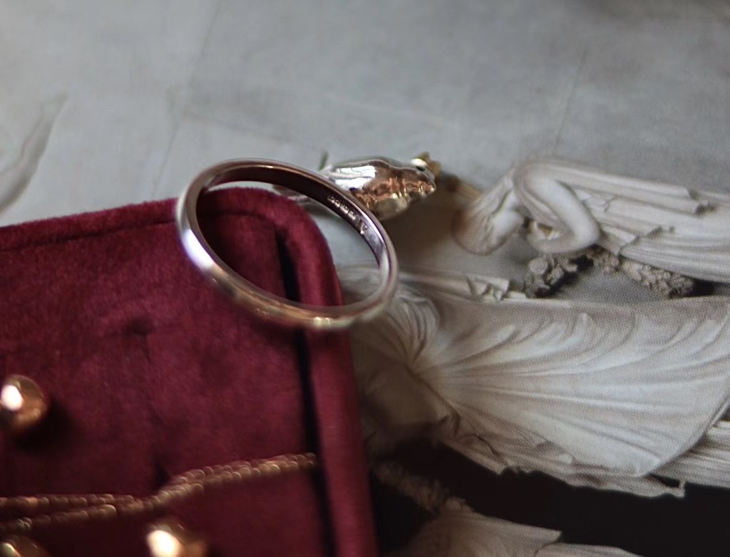 • ②.「路途之中」星路守护天使戒指环;以色列手艺人Irina作品;新艺术+现代主义;指环如一段星光铺陈的道路,天使行走其上。造型简练而富有叙事感,在微小尺度中展开空间想象。925纯银,镶嵌6颗钻石(约2mm);定制尺码;有刻字服务|x9026
