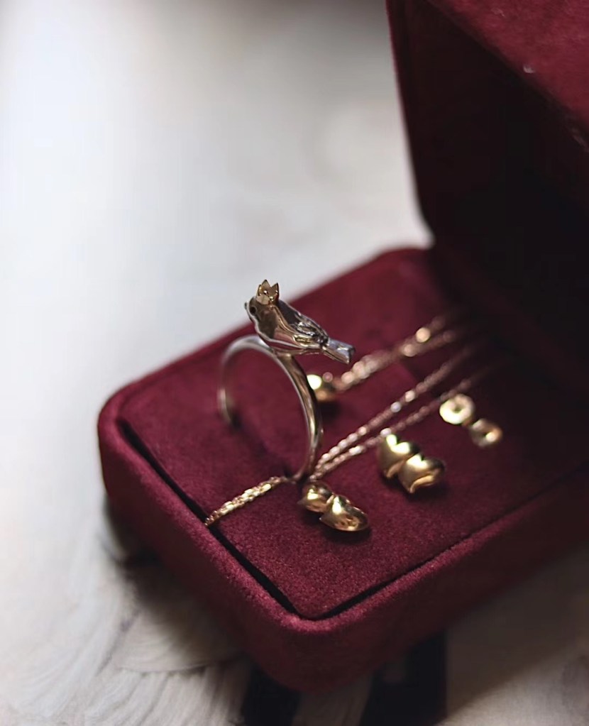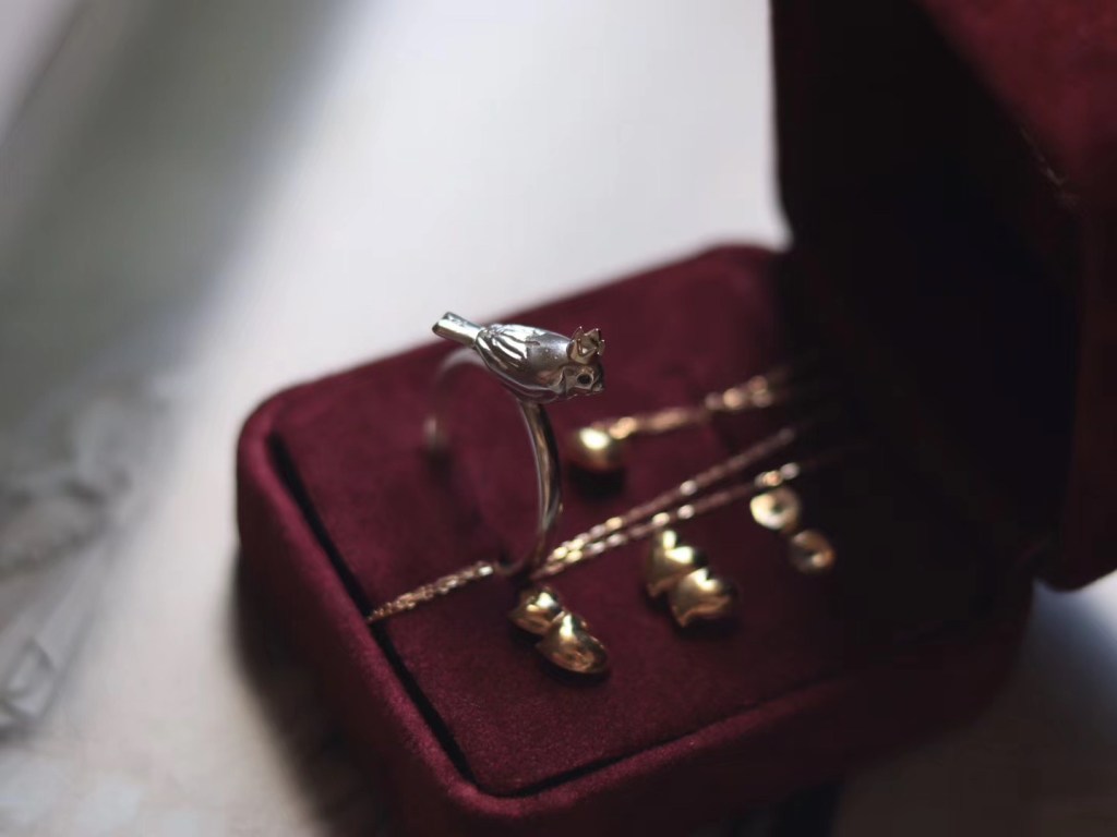 • ②.「爱与安心之所」鸟与巢项链;英国手艺人Magnolia作品;自然主义/现代主义;一个金丝鸟巢(灵感源自亚马逊的织巢鸟(Oropendola)):一只银鸟温柔守望着一只银蛋。巢穴穿过树枝圆环,彼此嵌合,像一个不断循环的场景。它像极了一种关于“家”的意象,或是关于守护、孕育与存留的记忆。鸟与巢的关系是庇护,也是责任;是安放,也是牵引。正如”家”不只是温柔的归处,也关乎时间、付出,以及持续发生的循环。镀24k金纯银+纯银(鸟与蛋);巢约3cm×1.3cm(手工编织,每件略有差异),链长约50cm|x9426