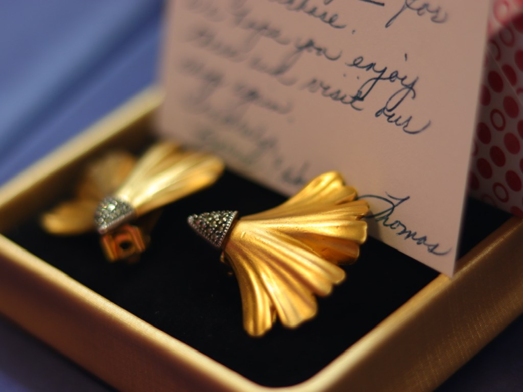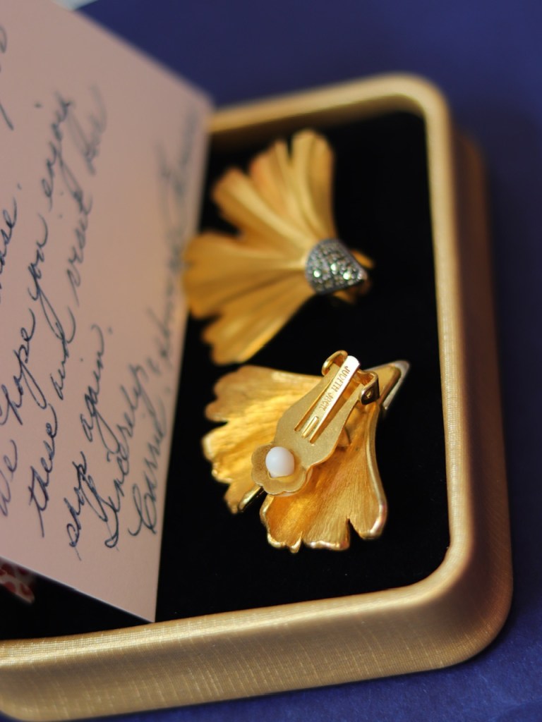 ③.精致复古Judith Jack埃及复兴(装饰艺术)银杏叶耳环;俄罗斯(缎子)金制成,底座是银色白铁矿;高1 1/4英寸,近乎全新(20181218)