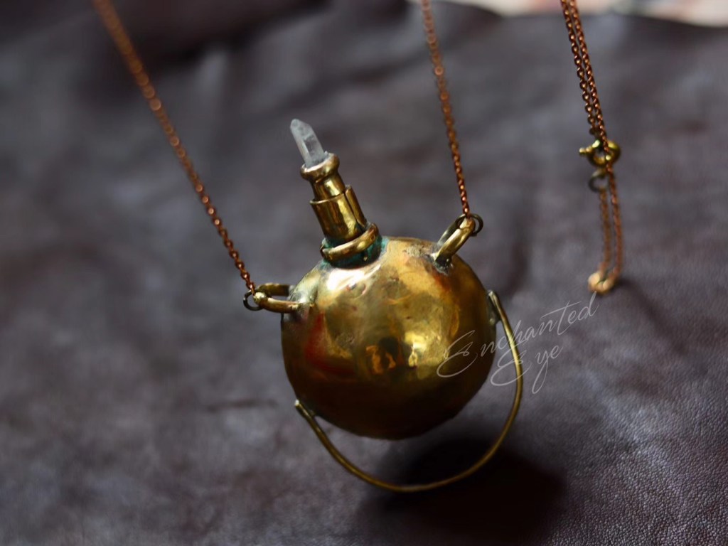 日式侘寂风·古朴神秘·药壶泪瓶香水香料瓶·项链;USA美国手艺人Raven;黄铜/白水晶;绝版(201812)