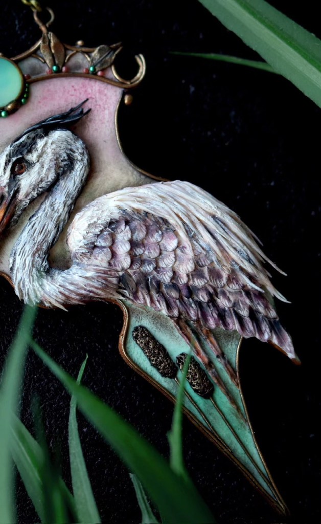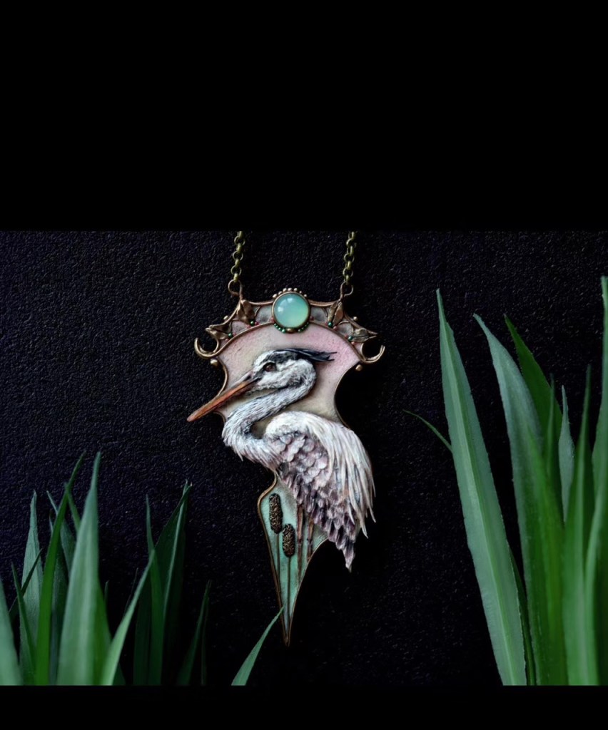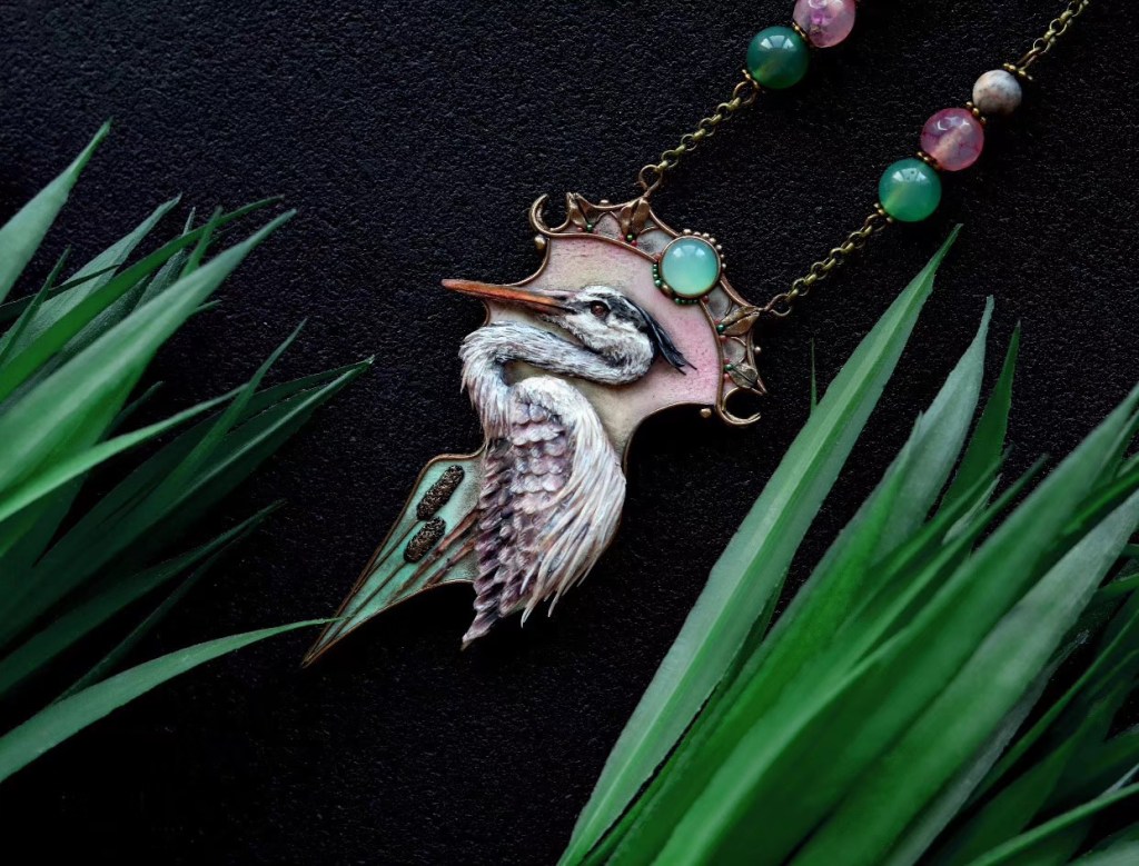 ③.「神鸟仙鹤」|羽色朴素纯洁,体态飘逸雅致,在优雅祥和的气息之上是纯真与超凡。Russia俄罗斯手艺人Valeria;软陶/天然宝石/金属等;新艺术复兴主义(201904客制单)