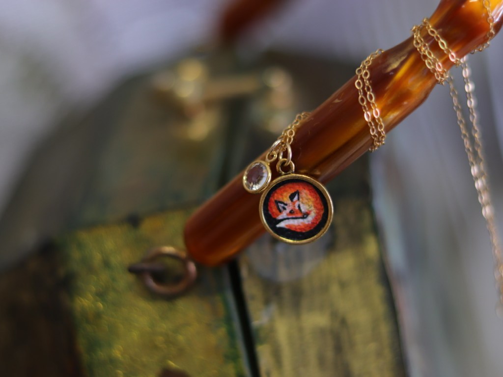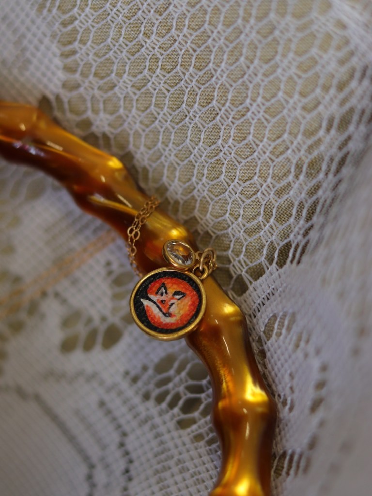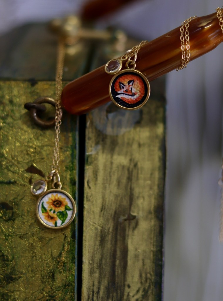 ①③.「小狐狸&向日葵」·手绘油画帆布·项链;美国手艺人Hedi;超迷你手绘作品(坠子直径为1.45cm,图片仅约1.3cm);画作材质为帆布与油彩(相比大多其他迷你画所使用的材料,其颜色层次更为鲜亮分明,艺术感自然更胜一筹),画好后放置于镀14k金黄铜底座中,再用专用罩光剂涂抹了保护层以防水,所以实物可以摸到帆布油画纸的纹理;已绝版(小狐狸1件;向日葵2件)