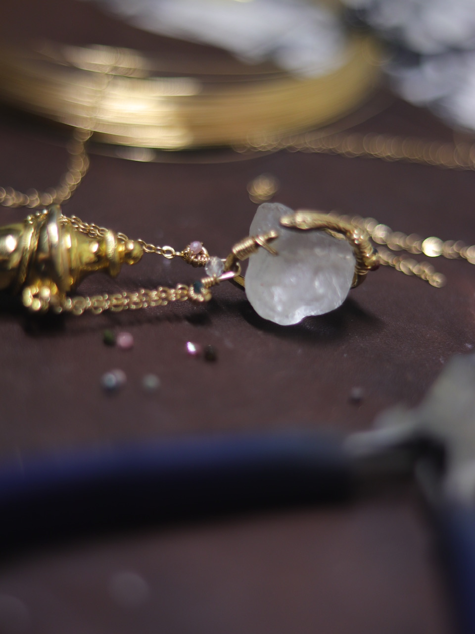 ②.「生成&孕育」贝壳珍珠意象·项坠吊坠;格鲁吉亚手艺人Natia作品;贝壳外壳以珐琅呈现,色彩层次丰富;内部呈现一颗夸张比例的珍珠,形成强烈的视觉对比。金粉色与黑色珍珠点缀其间,使整体在光泽与质感上产生变化。隐藏式挂环设计,使造型更完整。景泰蓝珐琅/925纯银/淡水珍珠,约5.5×4.5cm;前锋艺术,像一只眼睛,也让人想到维纳斯的诞生…;孤独品
