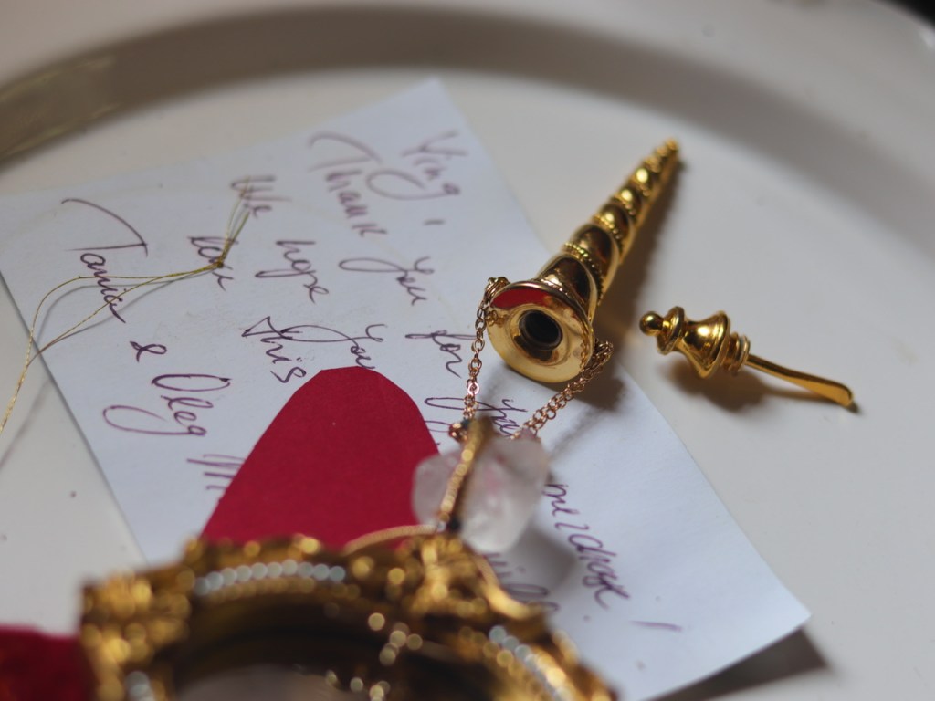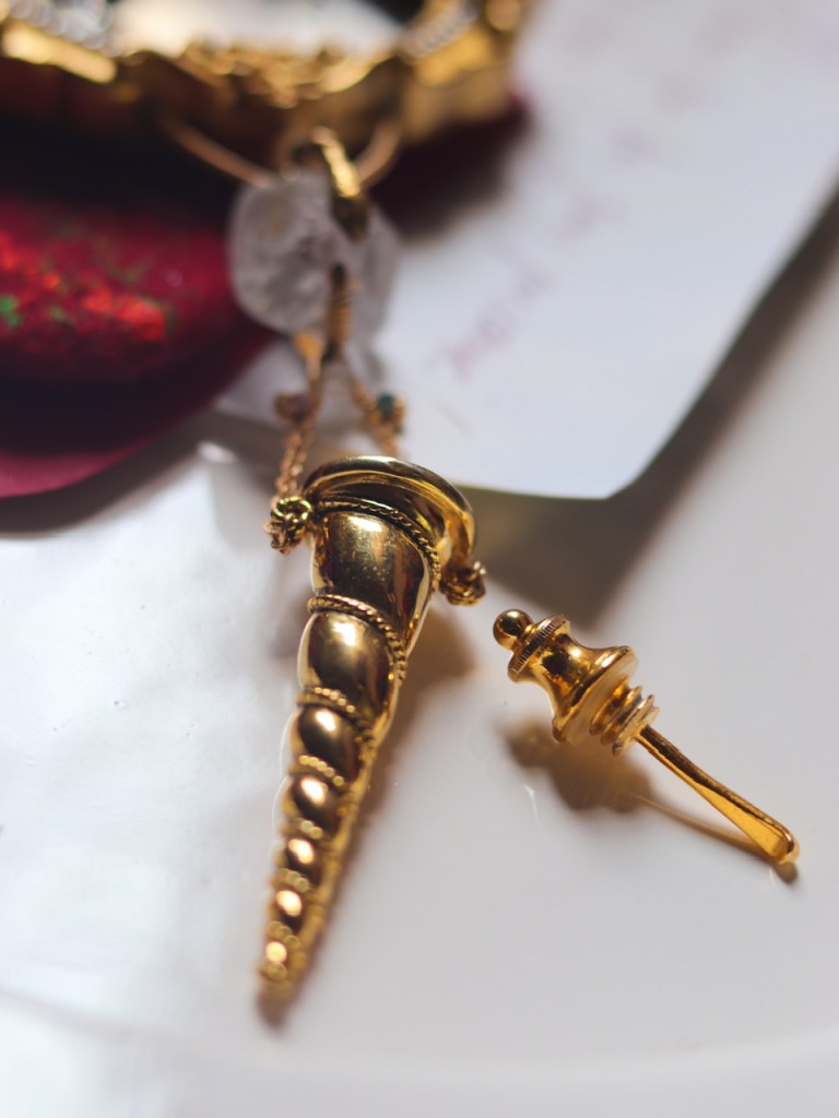 • ②.悲喜面具Moschino胸针;以古希腊戏剧表演中的经典面具为灵感,呈现喜剧与悲剧的情绪表情。夸张比例的纵向排列,金色表面带有做旧质感,将戏剧性与装饰性叠满。直接而富有表现力,将经典符号转化为更具时尚语境的表达。背部刻有品牌标记;约10.8×4.7cm;80年代制作
