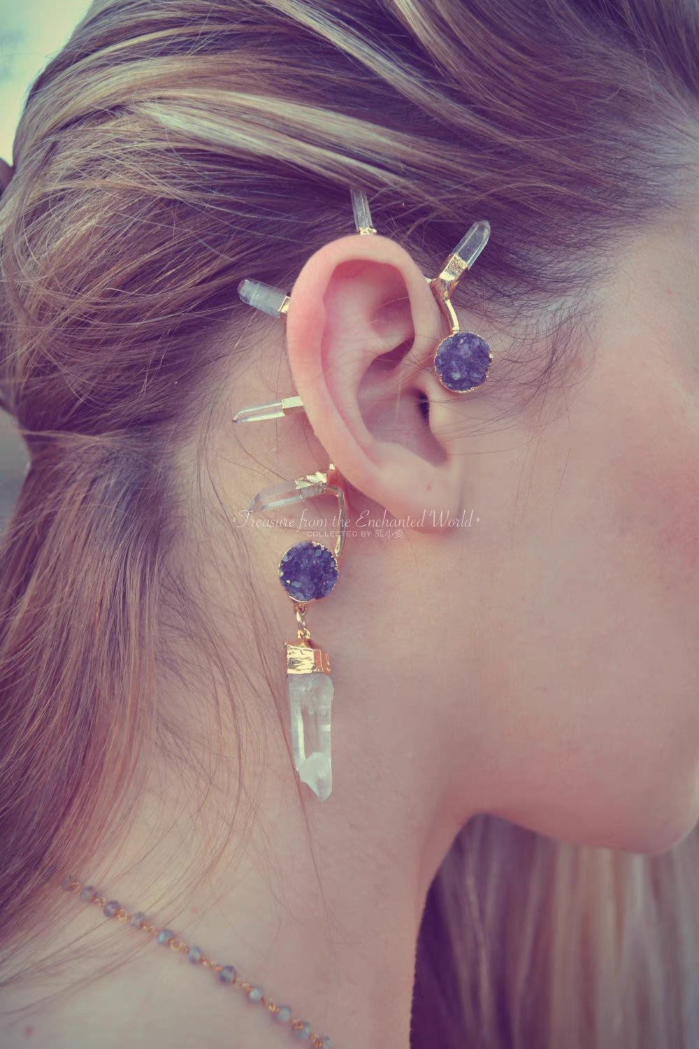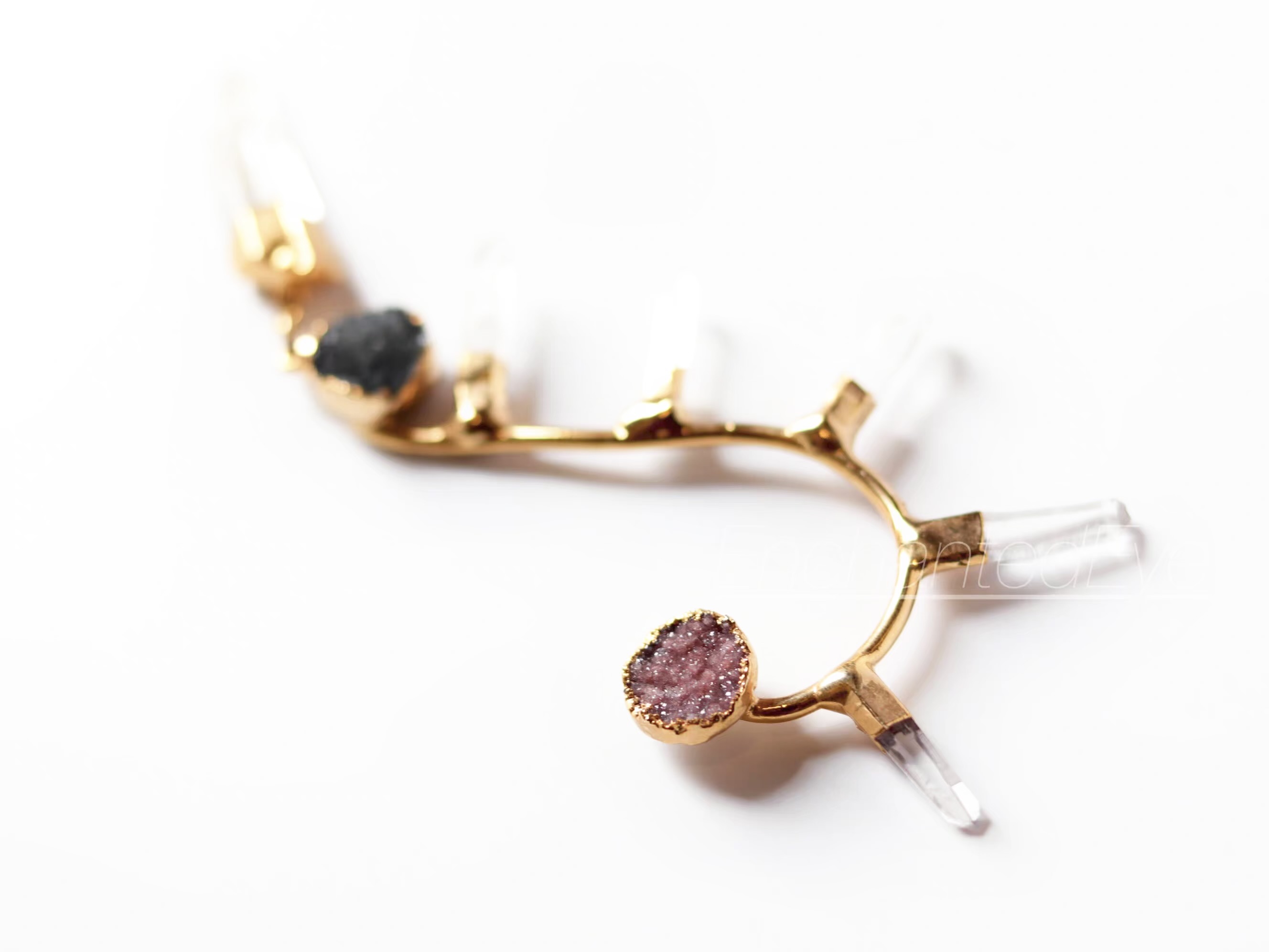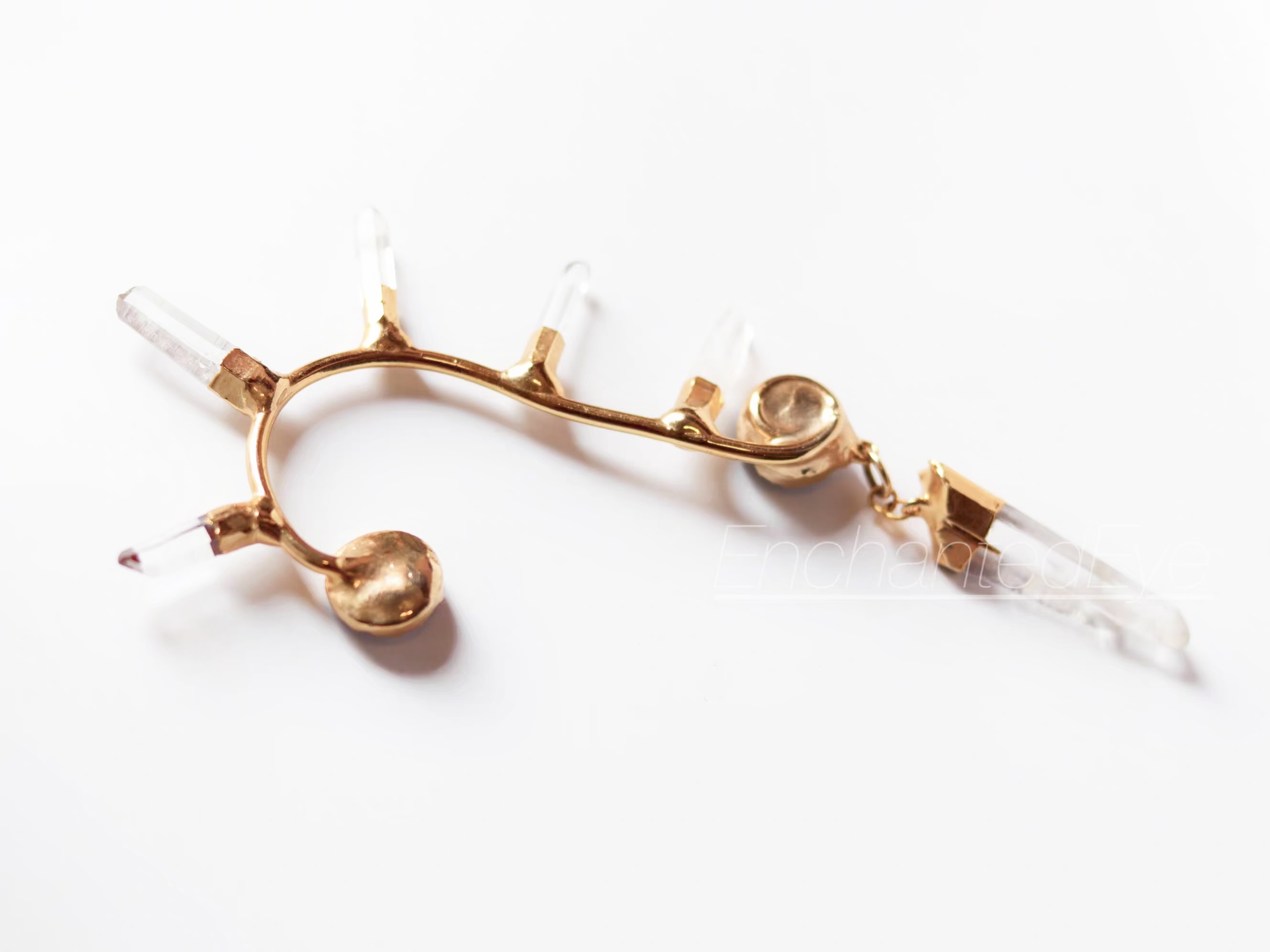 「自由灵魂」波西米亚式朋克峰状天然白水晶柱·镀金黄铜耳夹;定制于美国手艺人;单只右耳用;干燥保存避免磕碰