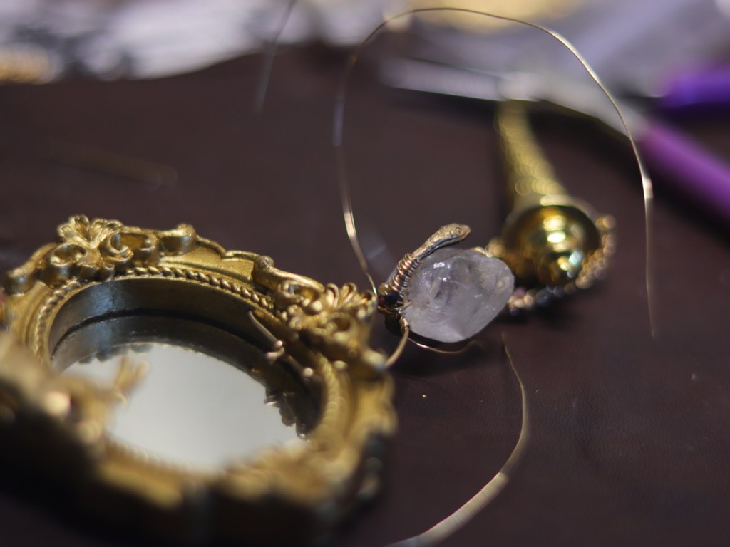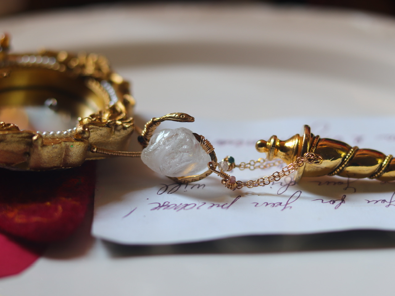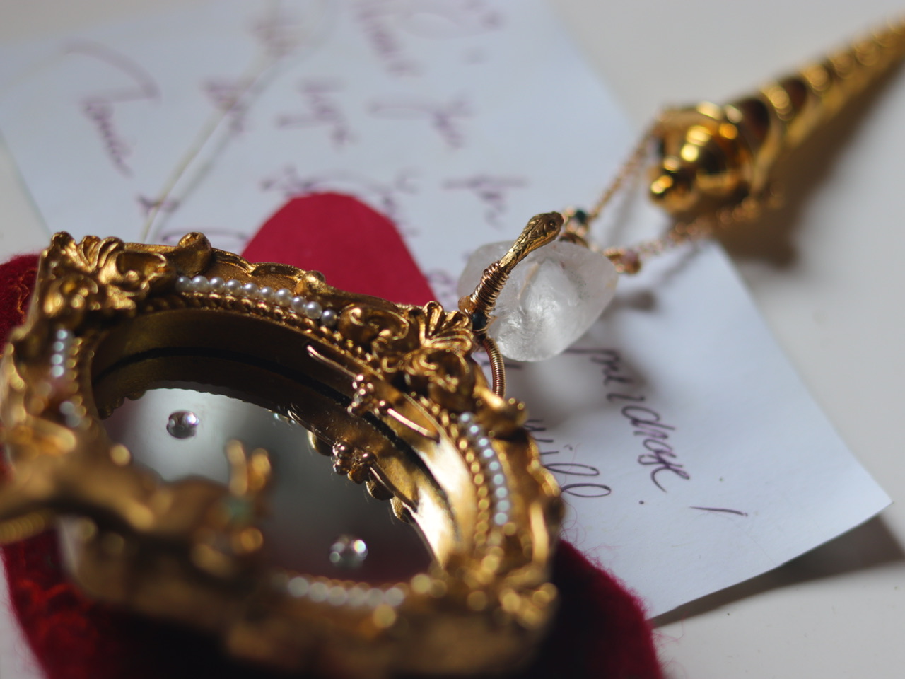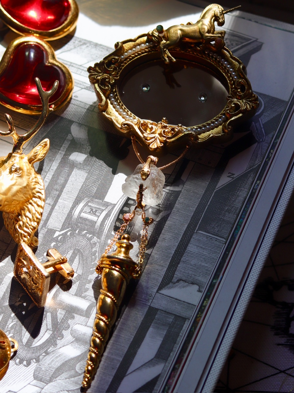 {独角兽}镜子·灵蛇·白水晶原石·80年代美制螺旋角形香水瓶·大胸针;香水瓶当时一眼就决定入手,回来搭配早前分别收集的水晶原石,金属印章和树脂相框镜等,就觉得合适;孤独品(201908)