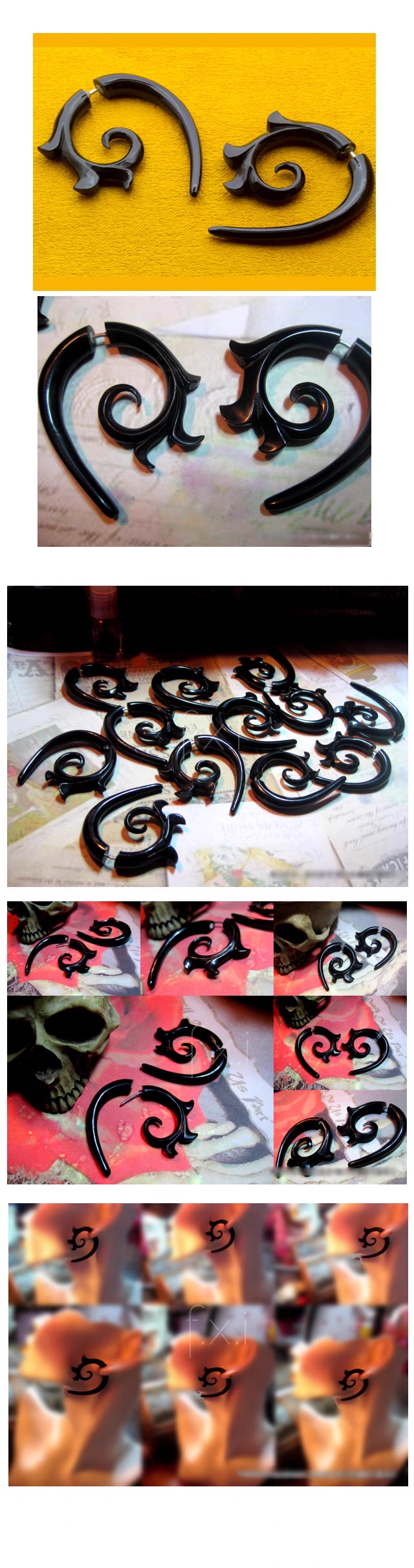 「龙纹身女孩·螺旋」朋克·部落风·假耳扩耳环;美国手艺人;耳环很轻巧,正反两面雕刻;水牛角+医用钢针+橡胶;约4厘米长;一对出;(关于材质:凡使用未染色的牛角/牛骨/木材/贝壳等天然材质制作的成品,若带少许纹路/颜色不均等天然现象,以及刀刻划痕等手工痕迹属正常现象。)每只均为手工雕刻,大小/曲度/外形等微小差异