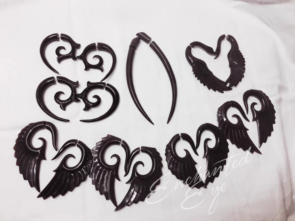 ①③.「龙纹身女孩·螺旋」朋克·部落风·假耳扩耳环;美国手艺人;耳环很轻巧,正反两面雕刻;水牛角+医用钢针+橡胶;约4厘米长;一对出;(关于材质:凡使用未染色的牛角/牛骨/木材/贝壳等天然材质制作的成品,若带少许纹路/颜色不均等天然现象,以及刀刻划痕等手工痕迹属正常现象。)每只均为手工雕刻,大小/曲度/外形等微小差异