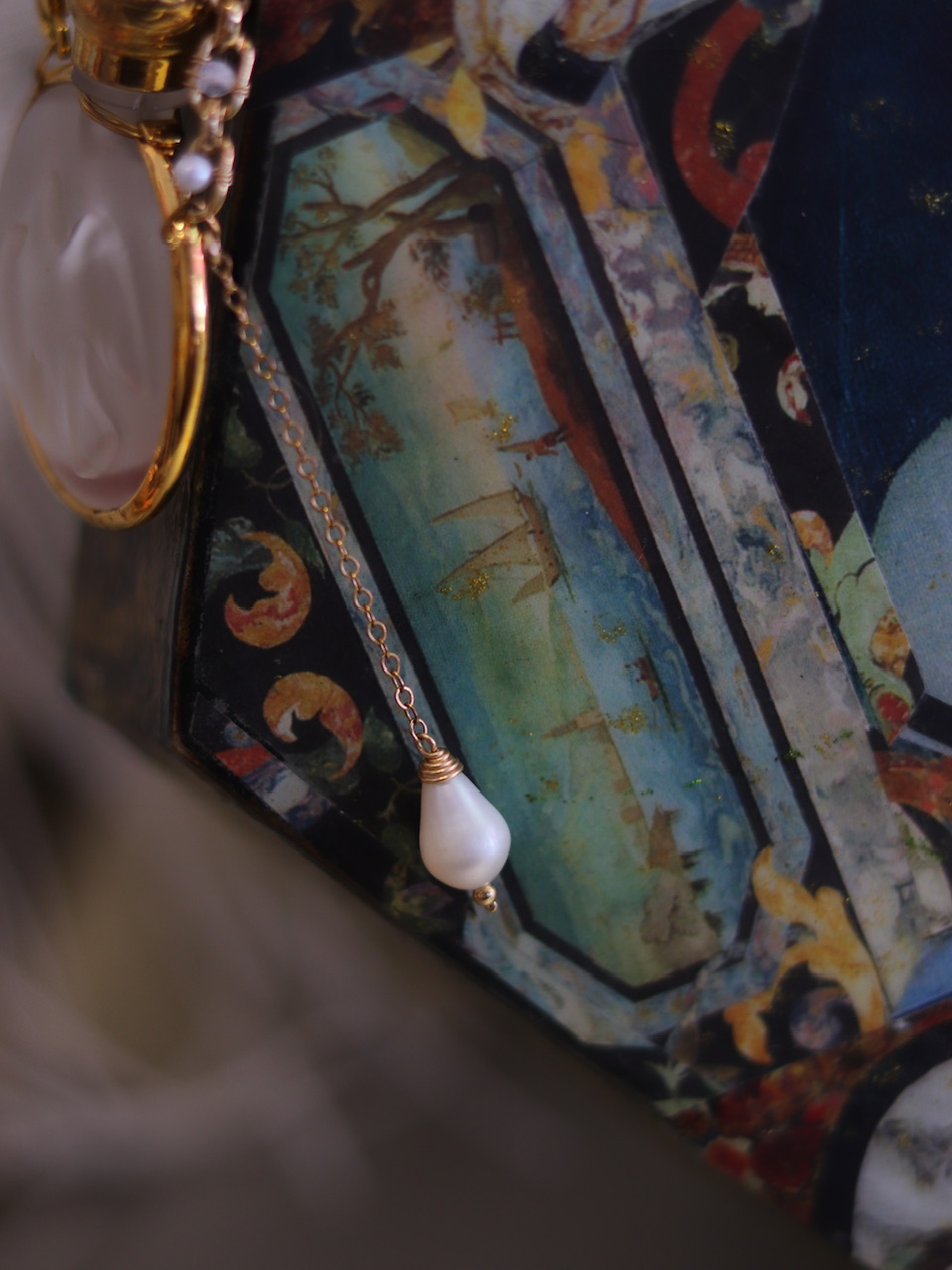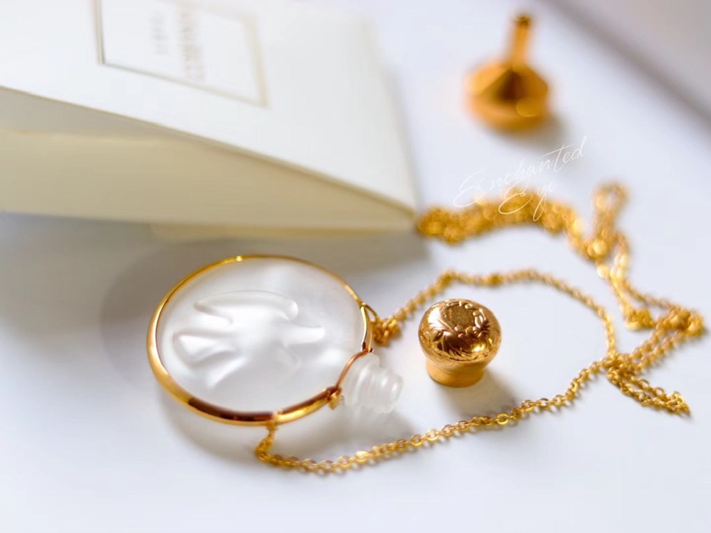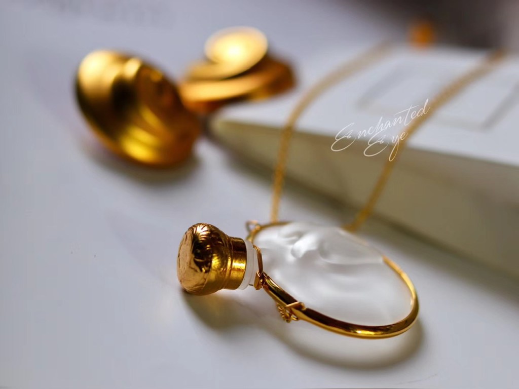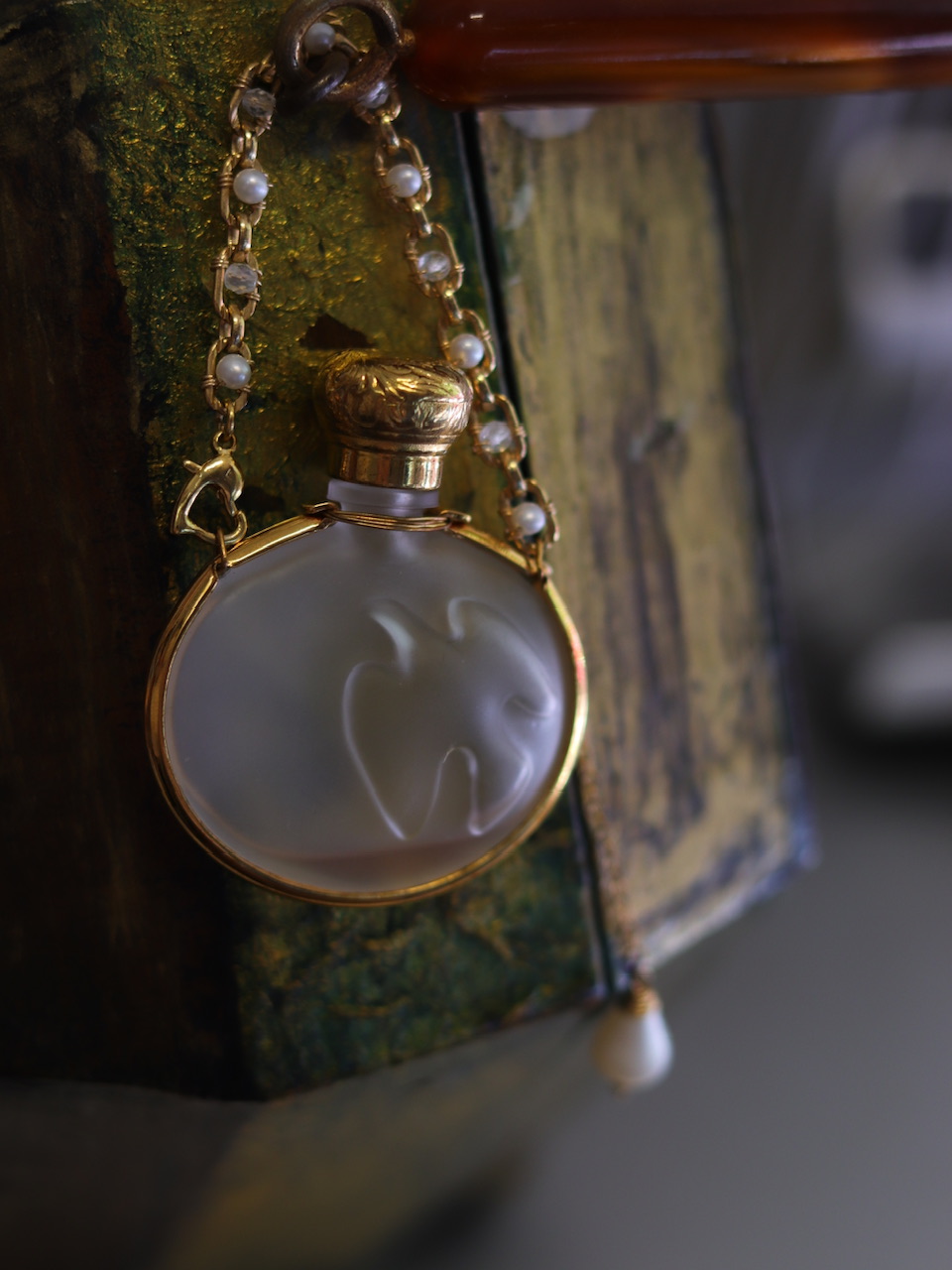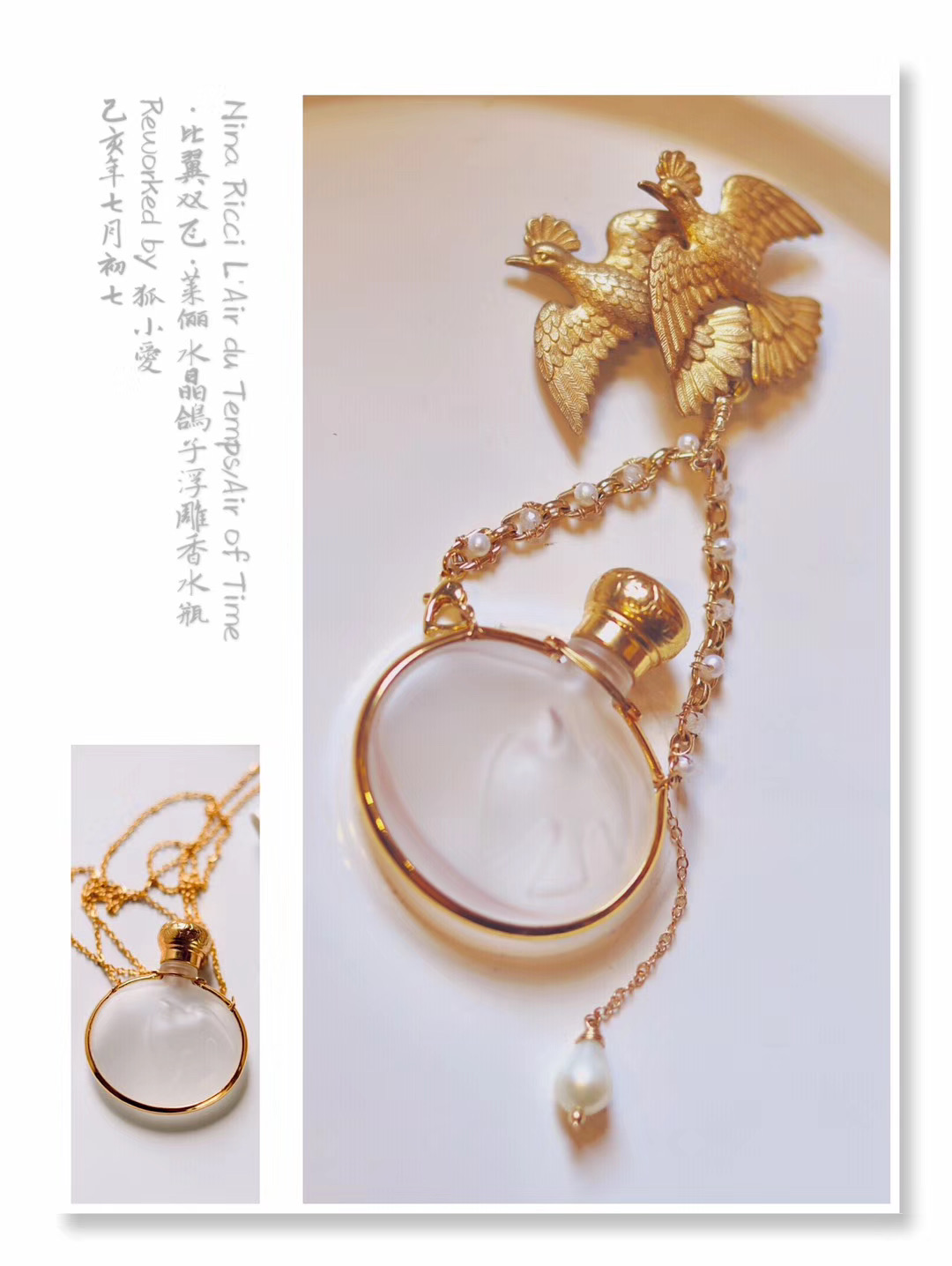 「比翼双飞·鸽子浮雕」罕见Nina Ricci·80s玻璃香水瓶·项链,稍微改制了一下链条部分;镀金古董机械手表表链/14k包金链/珍珠/月光石/镀金心形搭扣;孤独品(201908)