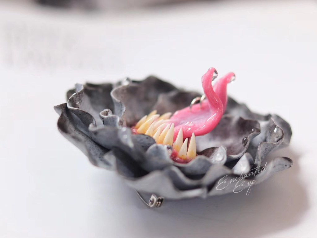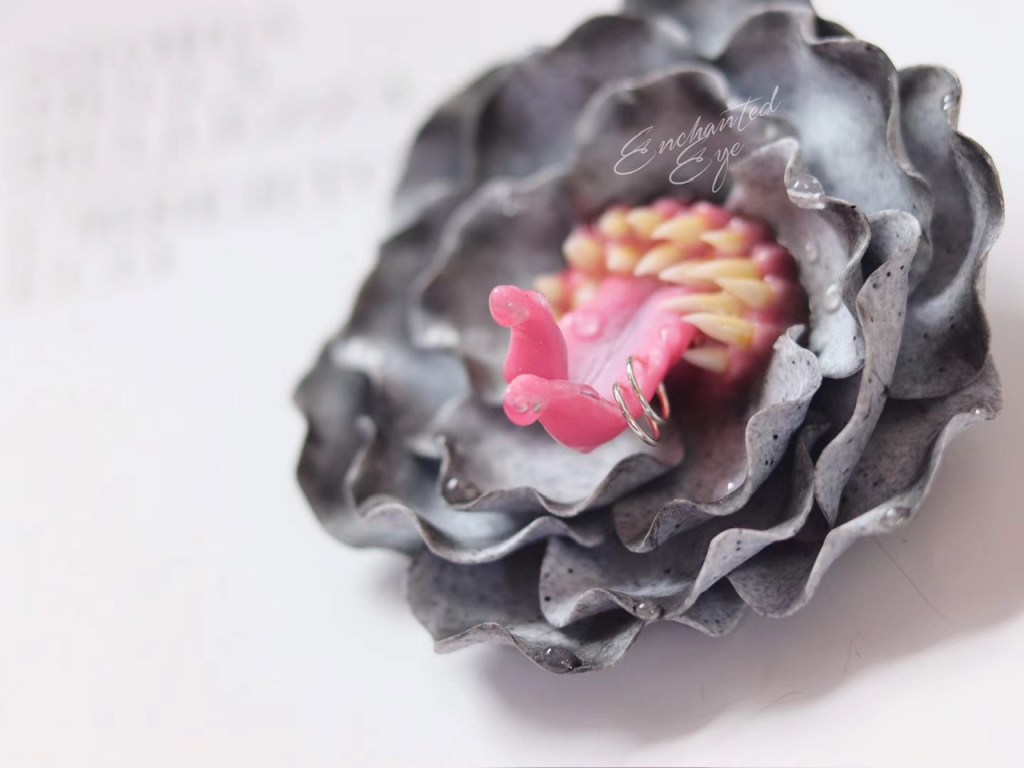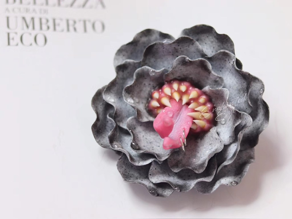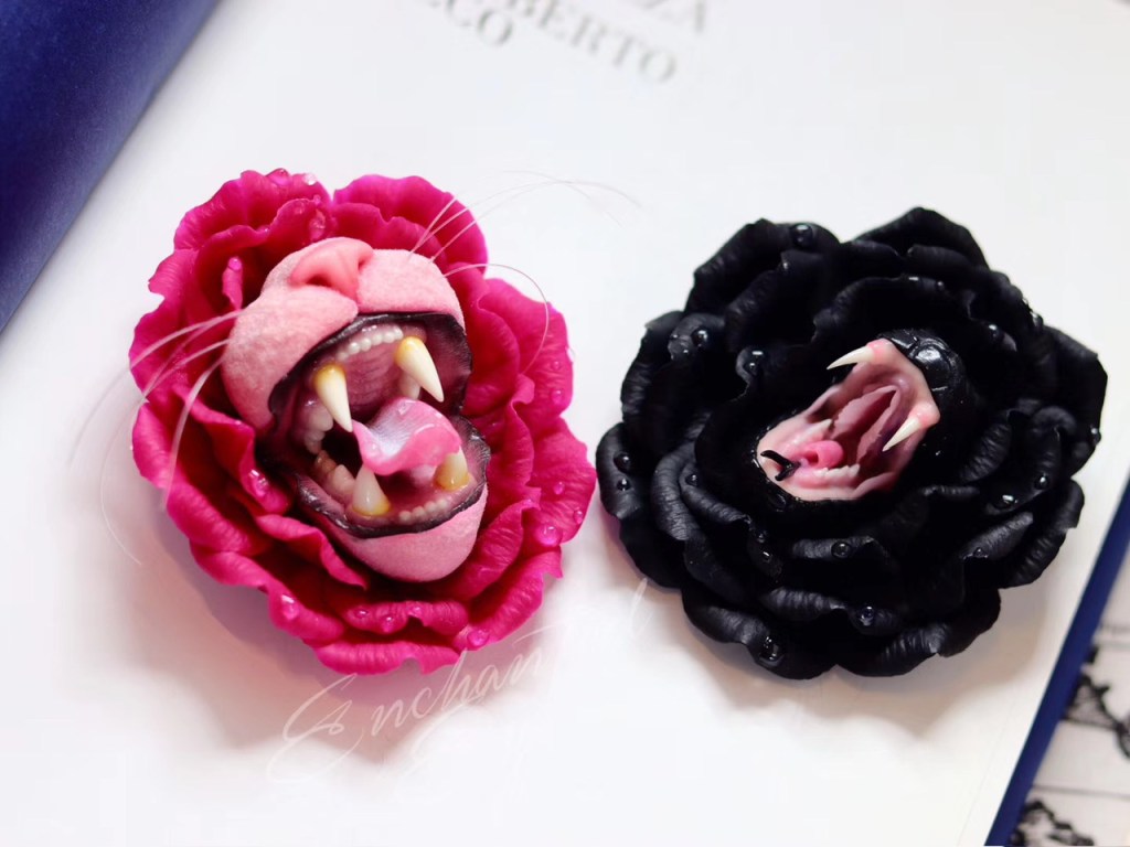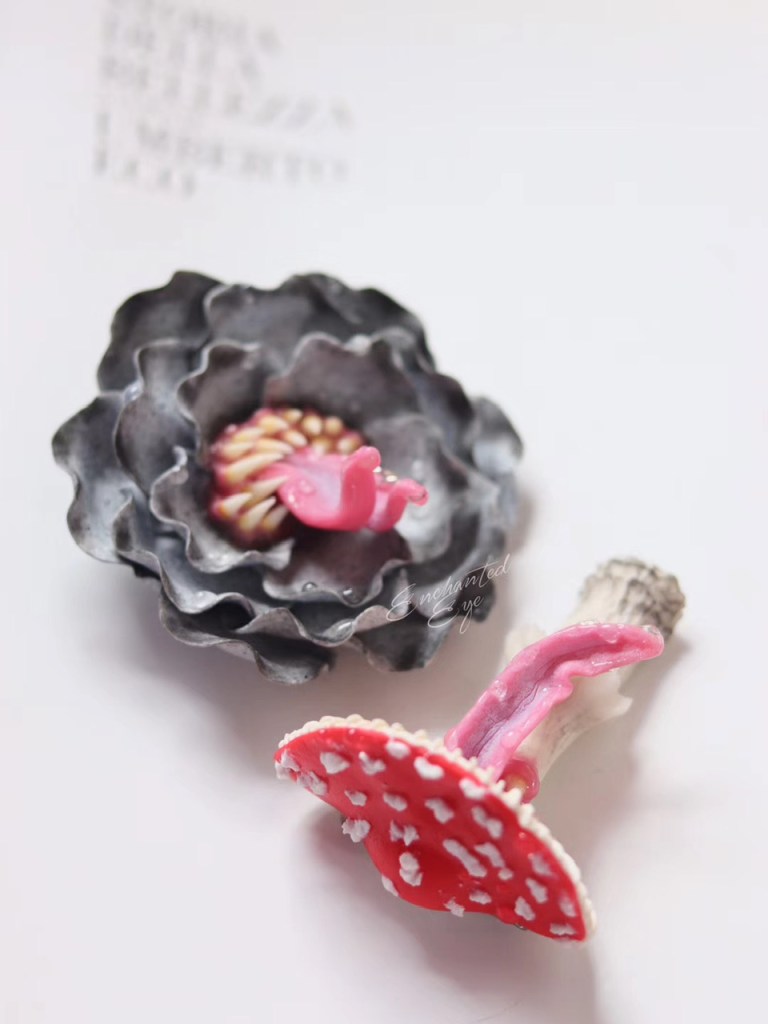 ③.「莉莉丝的花果园」系列·胸针;‘大丽花’蛇/粉红豹花朵,分叉舌蘑菇等,软陶/手绘等;定制于俄罗斯手艺人Mariya(201811)