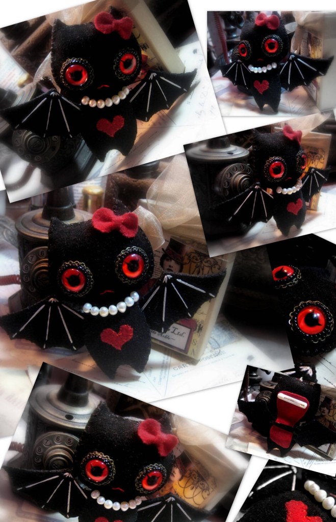 ③.好多年前…第一只「小蝠娃」羊毛毡胸针;造的小恶魔红瞳玻璃眼睛(环绕手缝珠饰),淡水珍珠等;后来还做过两只(其一蒸汽朋克版,图丢失),都寄给客人了(2011-2013)