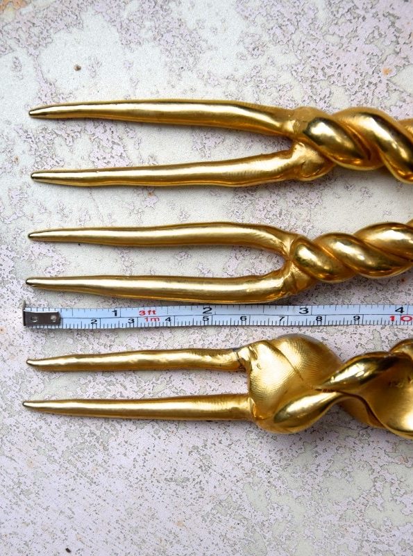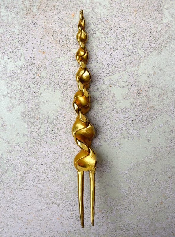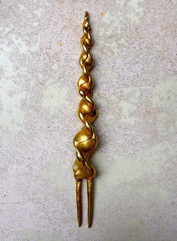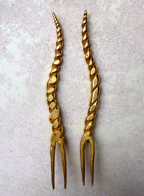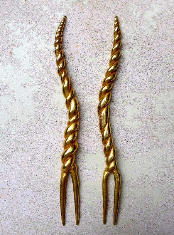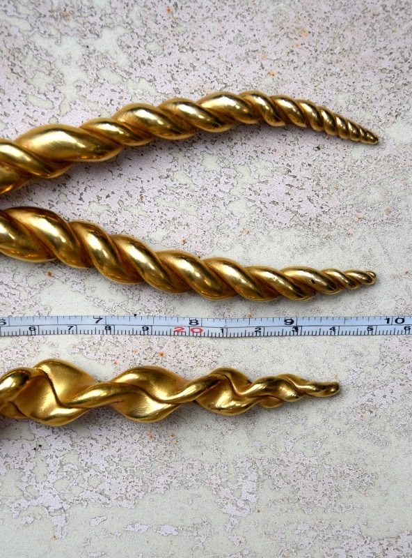 ①.独角兽&羚羊(夏奇拉)·Head Ornaments发簪头饰;80年代OLIVIER GUILLEMIN;《疯狂动物城》;由弯曲塑形的树脂制成的美丽的花苞头发簪,外覆盖镀金黄铜薄片(手感是冰凉的金属却很轻巧);收藏于“LES DAMES À LA LICORNE(独角兽女士们)”系列,1986年;未签名展示样本(20210305)/可出左右对称弯曲的羚羊那对-如图美丽完好的复古状态;中间的买来就微瑕,依个人喜好做改造后自留