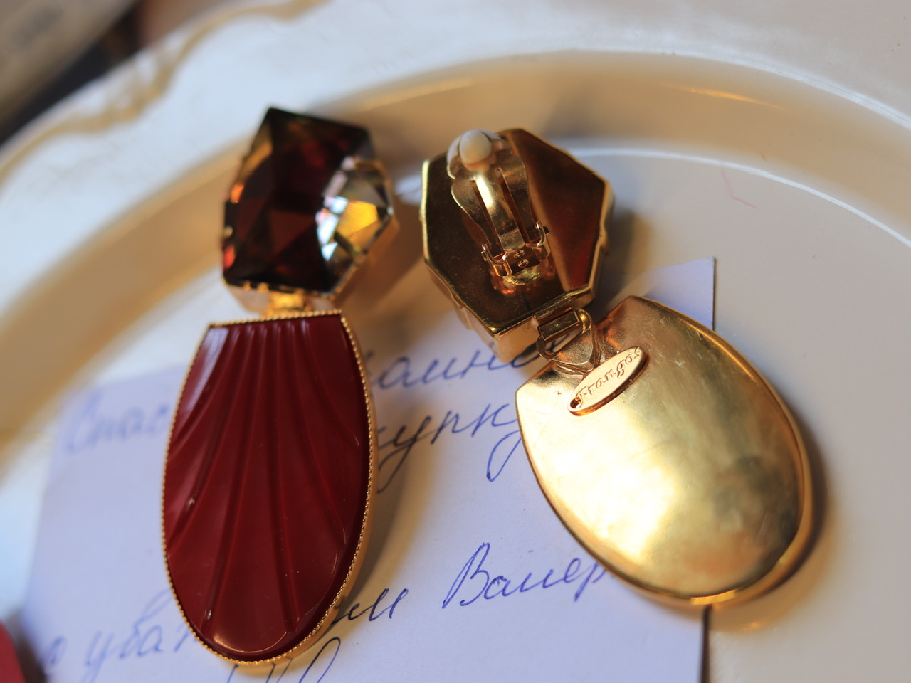 装饰艺术风Artdeco·红色贝壳纹·人造水晶Frangos长耳环;树脂/奥地利钻/镀金黄铜;80年代制造(20190606)