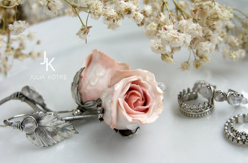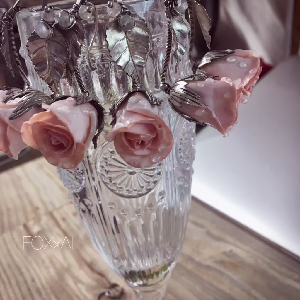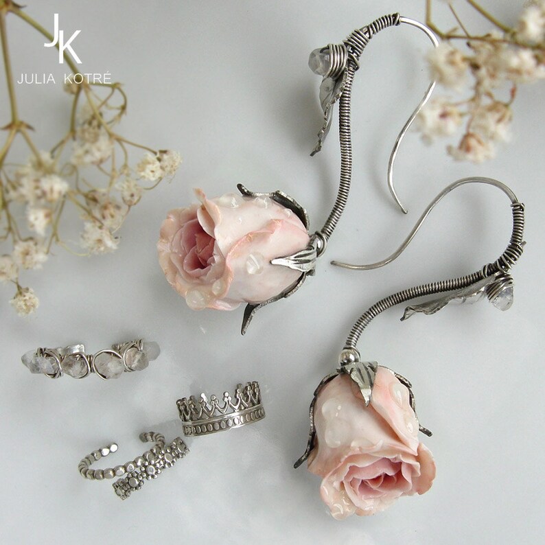 「玫瑰谷公主」,1副耳环+4只可叠戴的小耳夹;定制于德国手艺人JuliaKotre;纯银/手工硬陶玫瑰/月长石;绝版(20161017)/图待更