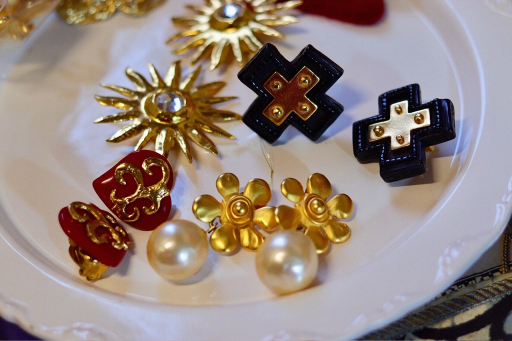 • ②.独特半月圆红宝石复古90s耳环;Estelle Bijoux诞生于20世纪中后期,这类小型金色耳饰体现当时对优雅日常佩戴首饰的追求:既有视觉亮点,凸显个性又不会过于张扬。3.2×2.5cm,背面签名;镀金合金/树脂;法国