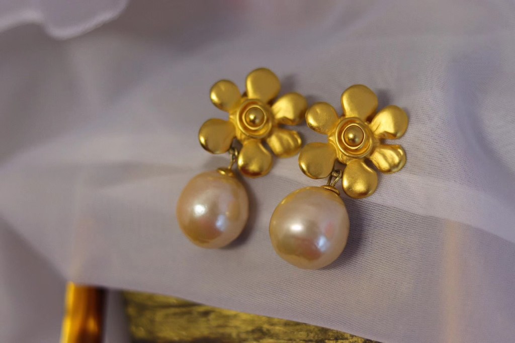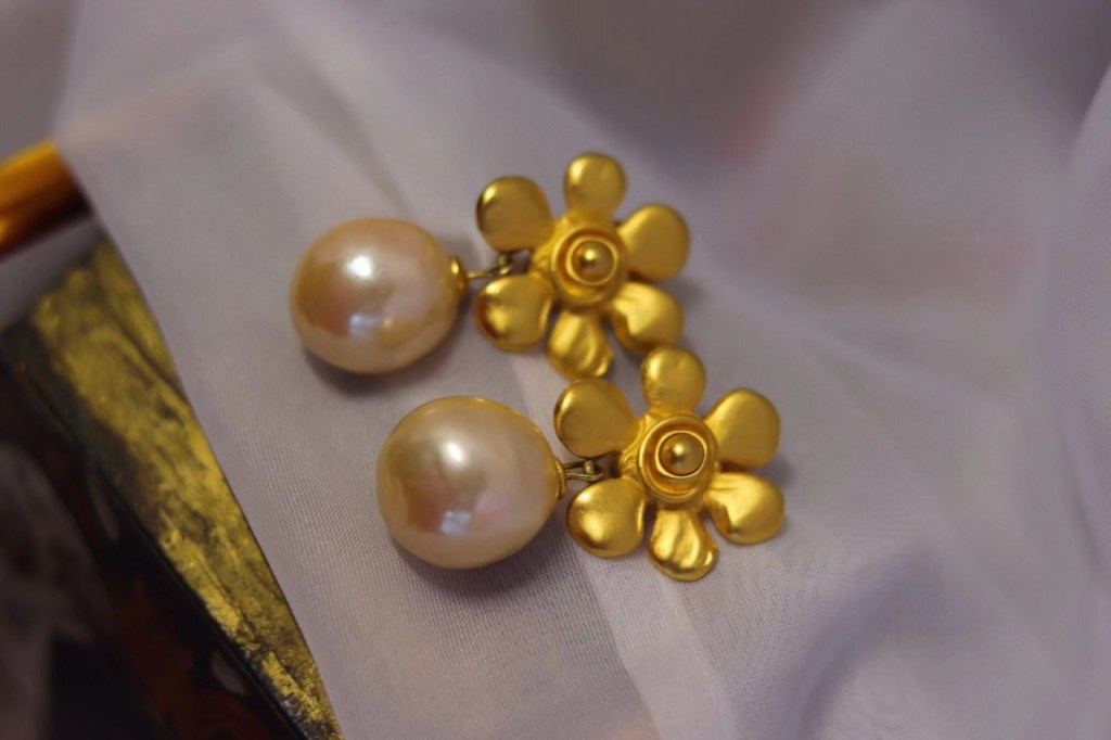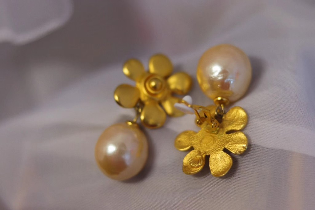 ③.「雏菊」耳环;KL老佛爷;80年代Karl Lagerfeld;巴洛克珍珠/镀金;近6厘米长,珍珠约2厘米大小;似库存品,近乎全新(20190317)