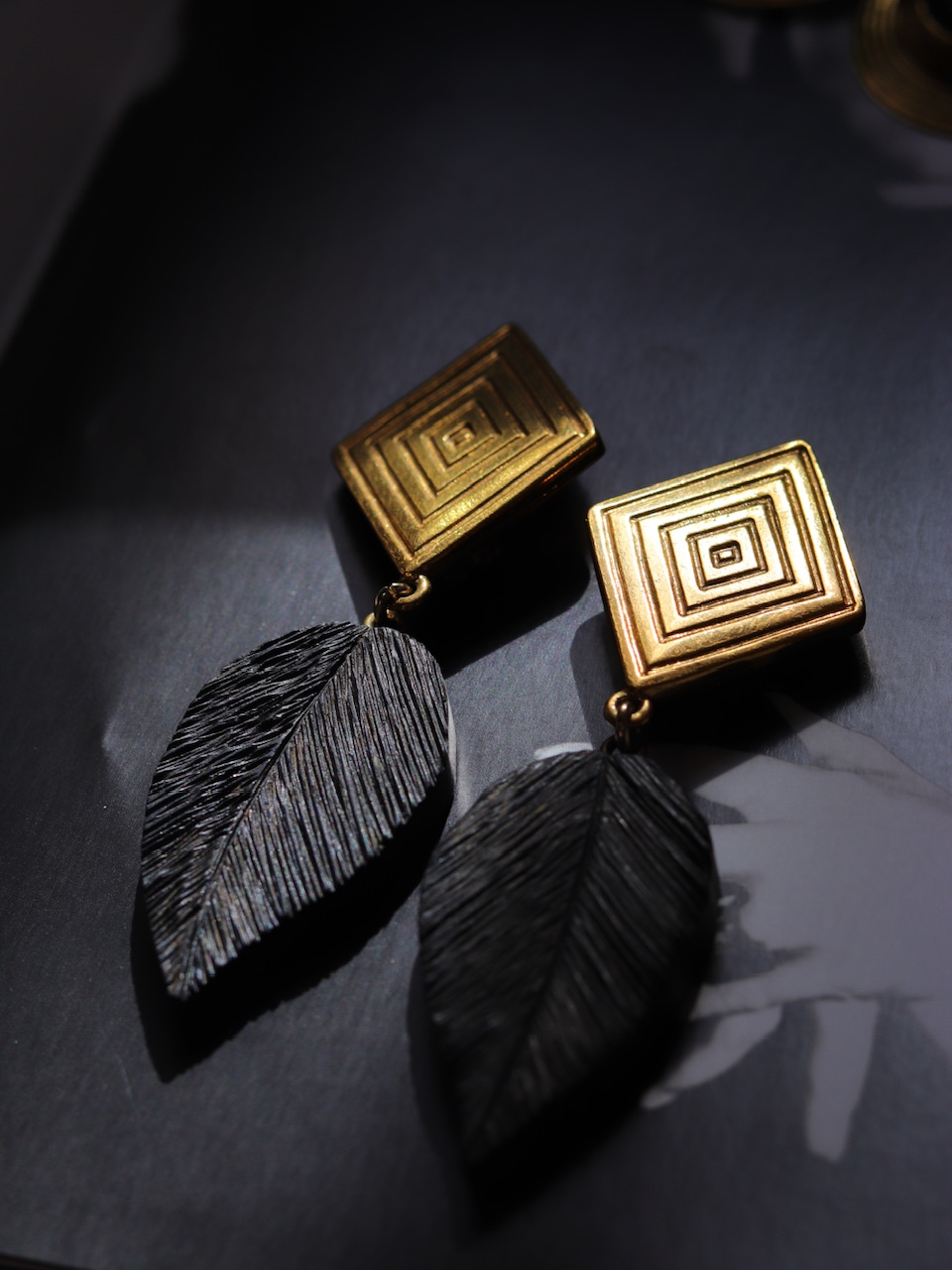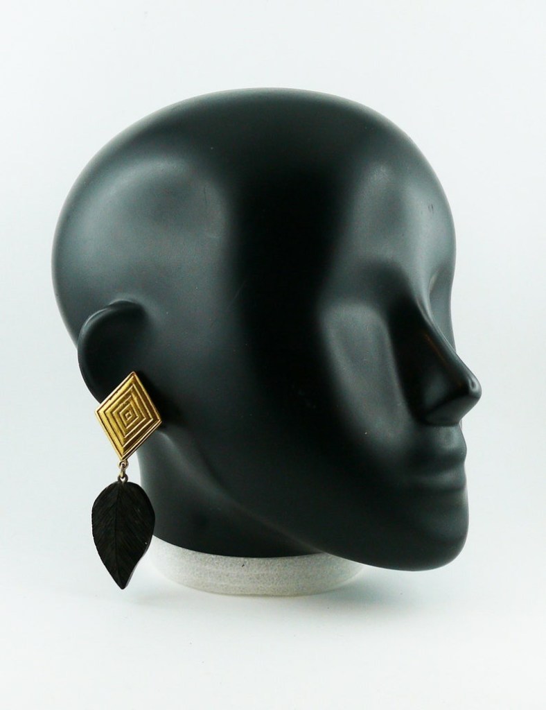 异域情调·钻石形几何图形·原木细密纹雕刻叶子耳环;80年代YSL;8.5×2.7cm(20181202)