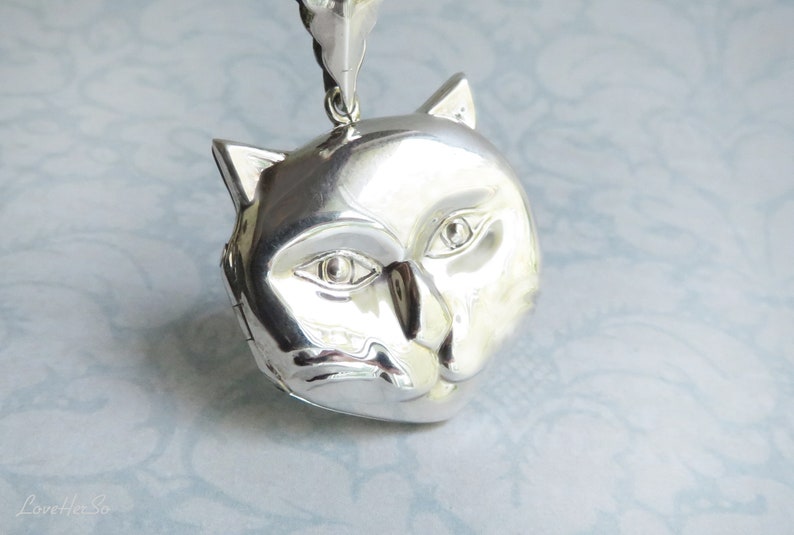 甜美咪·Cheshire Cat柴郡猫·猫头相盒·项链;1980s美国制造;可爱的脸长长的胡须大大的富有表现力的眼睛,脸上还挂着甜美的微笑;内侧标有“925”;非常好的复古状态,小盒紧紧闭合(除银色以外的颜色都只是附近物体的反射);小盒长 1 3/8 英寸(包括吊环)/1 英寸长(不含吊环),1 英寸宽;后搭的镀银链长 16 英寸,加 2 英寸延长链,总长 18 英寸,链子也可以自己更换哦(20190702)