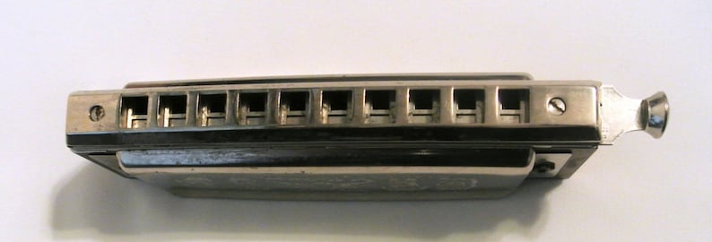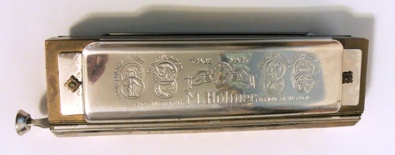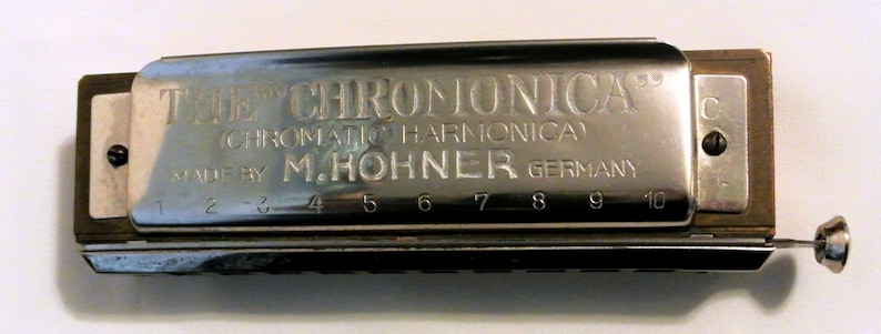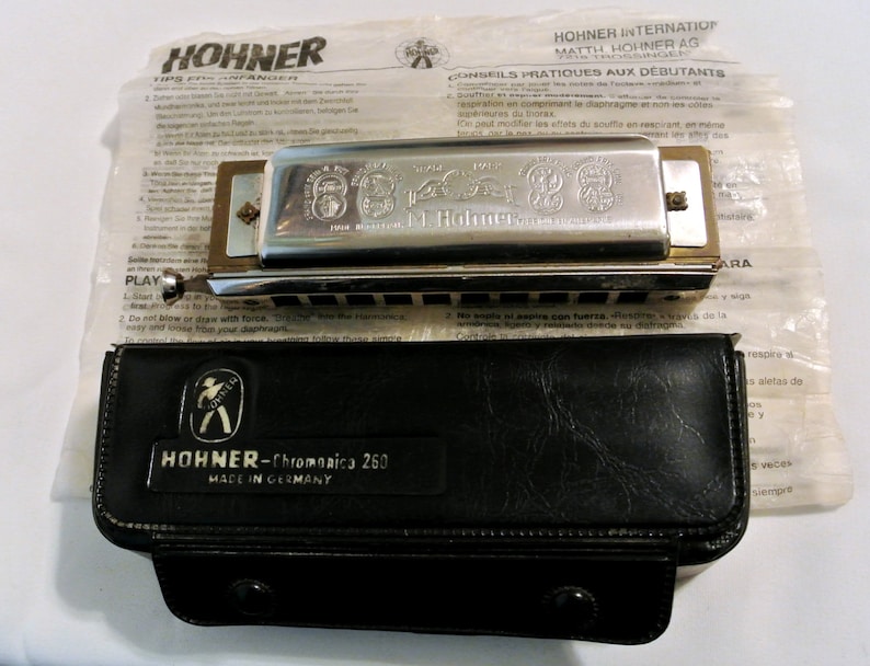 ③.德国制造的老式 M. Hohner Chromonica·口琴;大概是1930年代;原装的黑色皮套;说明书有德语、英语和法语;由原木和铬制成;没有生锈损坏,复古极佳状态;尺寸-5 1/2″ x 2 1/2″ -14.0 厘米 x 6.4 厘米(20170504)