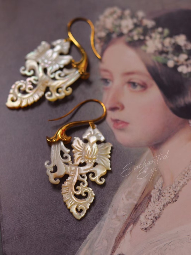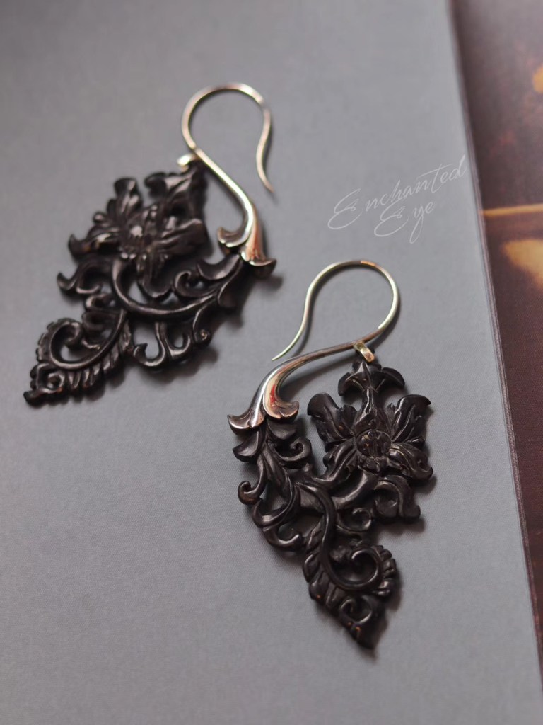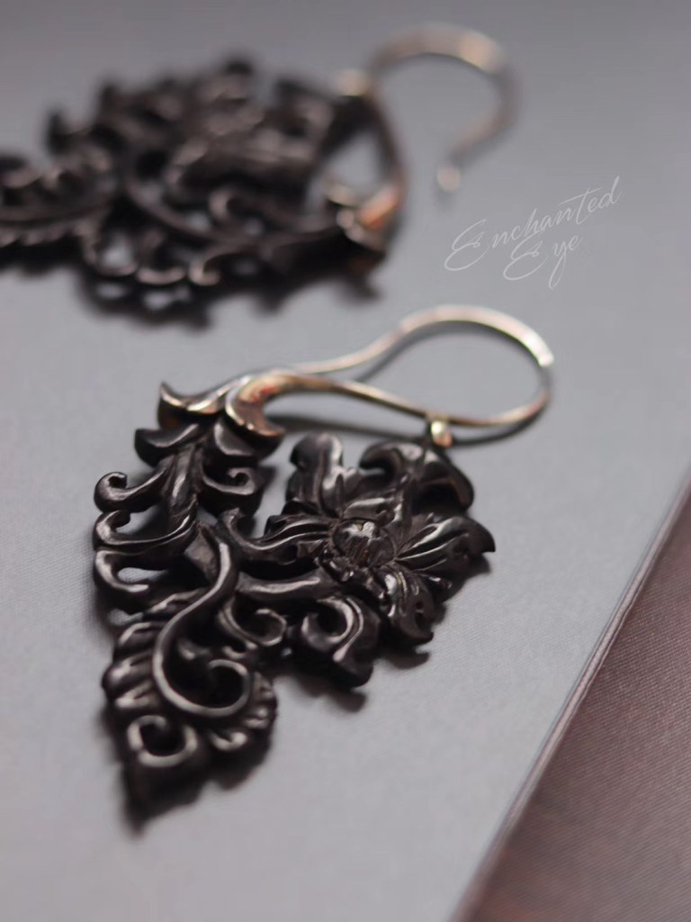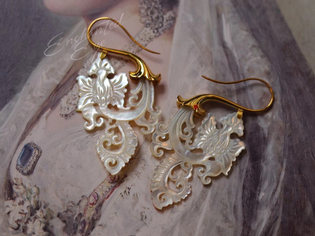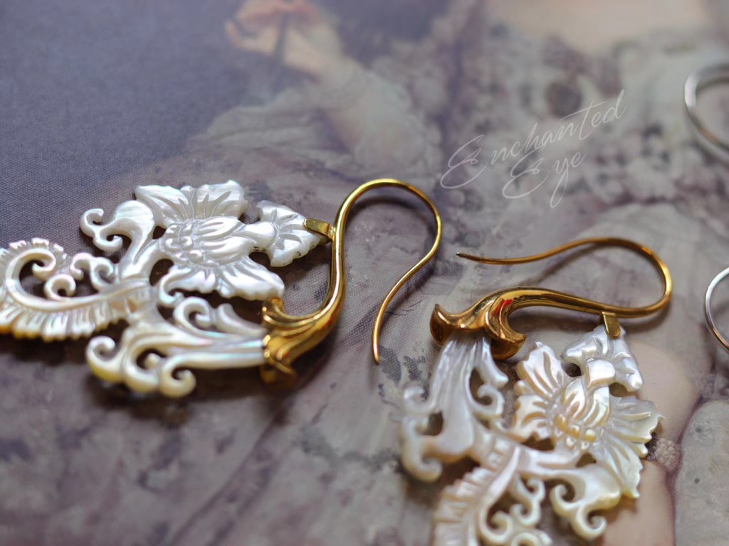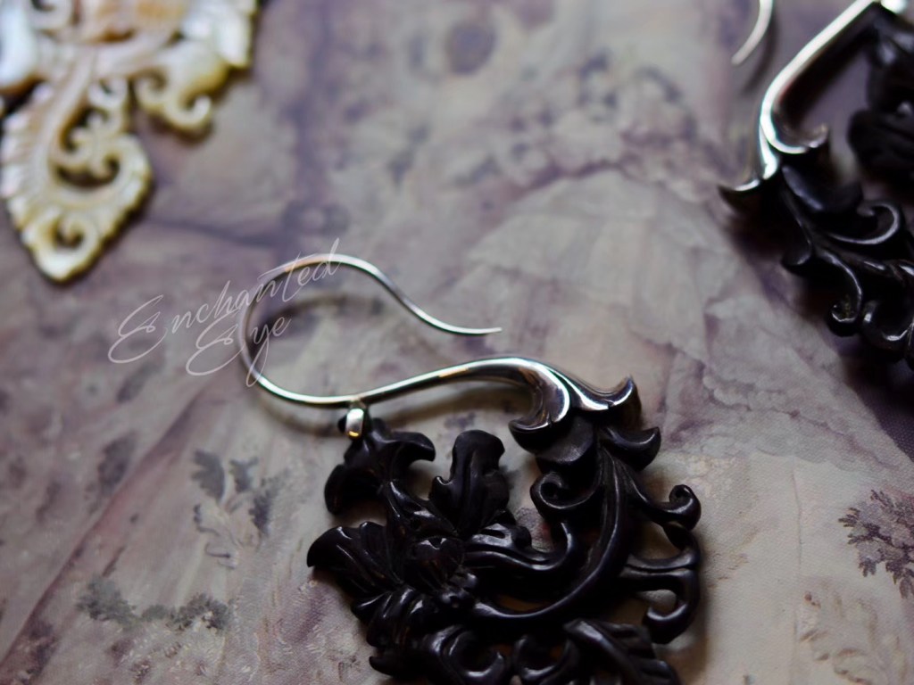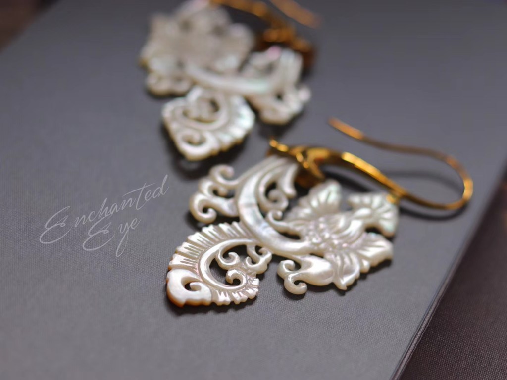 ②③.「Paisley佩斯利」花纹·手工雕花·大耳环;定制于美国手艺人OpulentAntiquity;ArangWood阿朗木&镀金黄铜//珍珠母贝&纯银(由于贝壳的有机性质,颜色会略有不同,从白色到灰白色再到黄金色,同理黑色木料);异域风情,别致,细腻光滑且轻巧;奢华波西米亚风(20190111)
