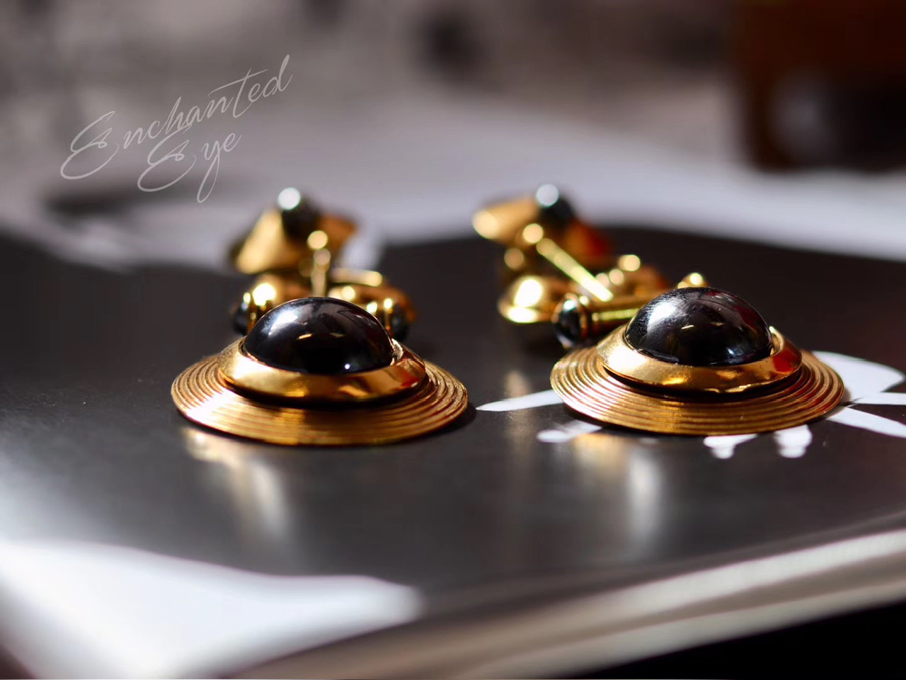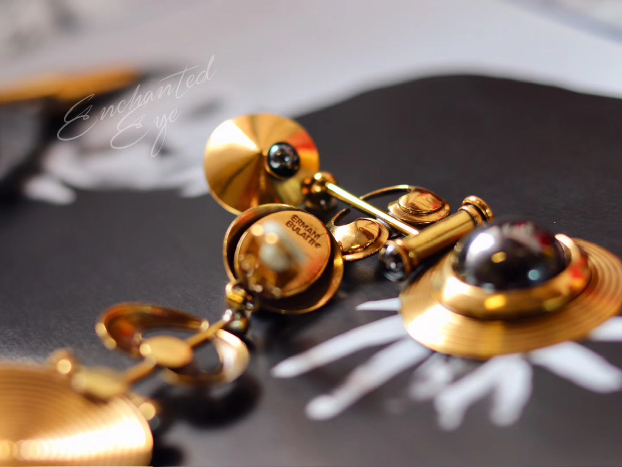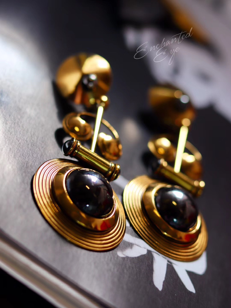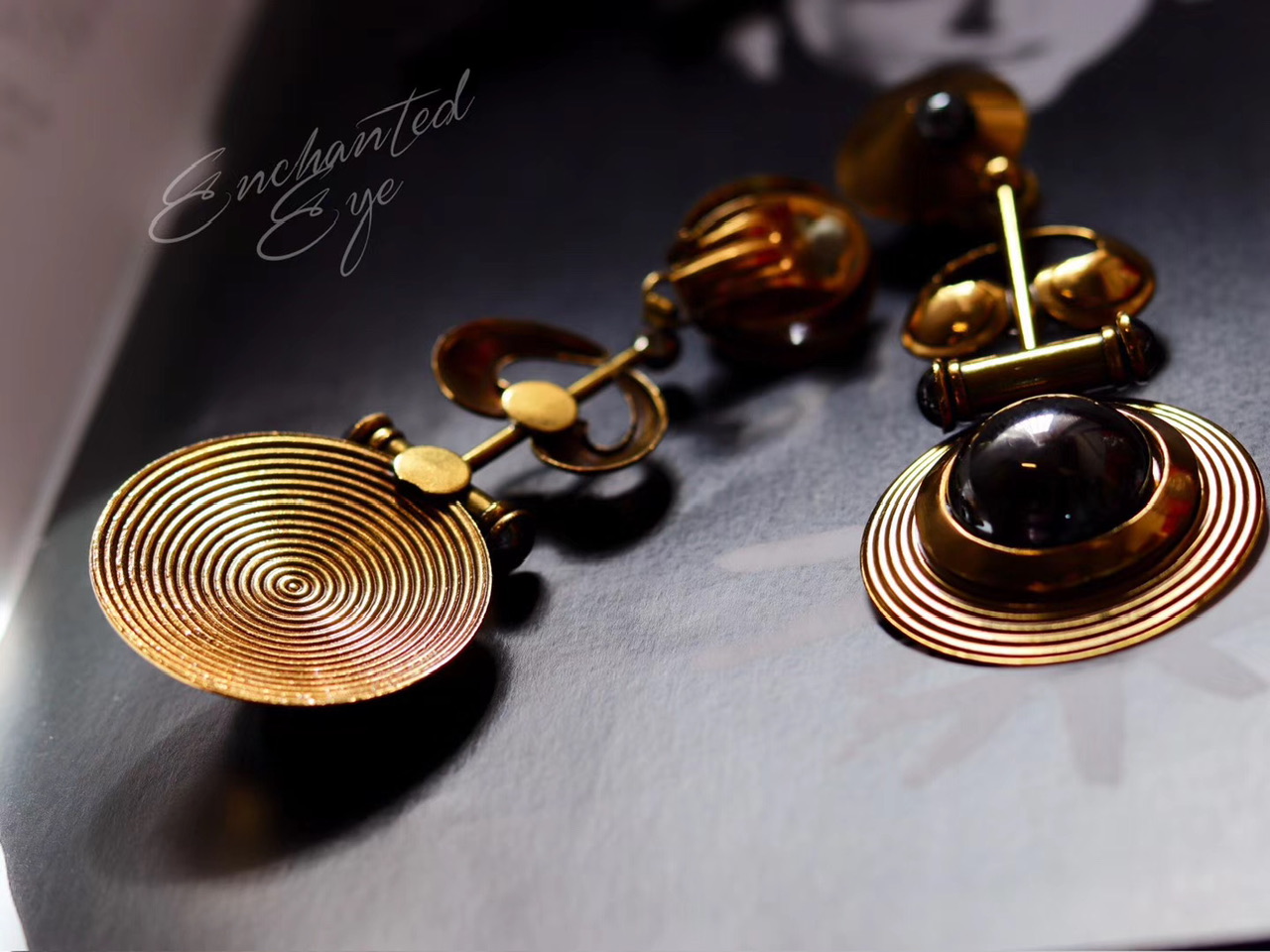 装饰艺术1920s风格·Art Deco长耳环;几何图形·唱片乐器造型组合;1980年代美国制造;镀古金黄铜/赤铁矿(20181220)