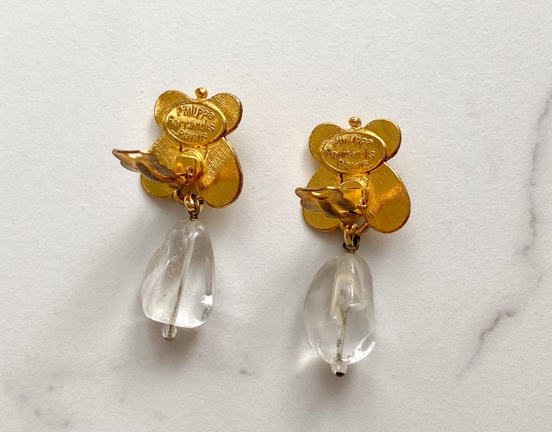 ①.古典主义油画风·蝴蝶·耳环·PHILIPPE FERRANDIS Paris·80s·PF;蝴蝶设计,中央镶嵌紫红色人造宝石,并配有白水晶吊坠;整体复古状态良好-吊坠背面有一些凹痕;夹子背面有“Philippe Ferrandis Paris”的签名;大约5.3厘米(20210819)#VP
