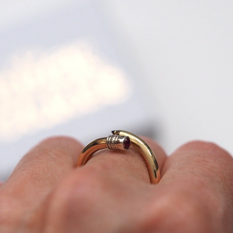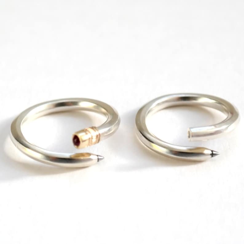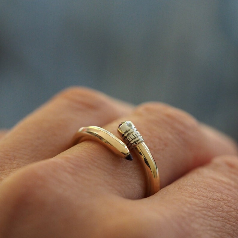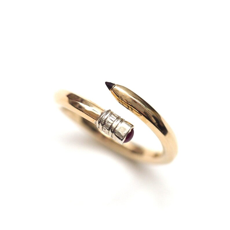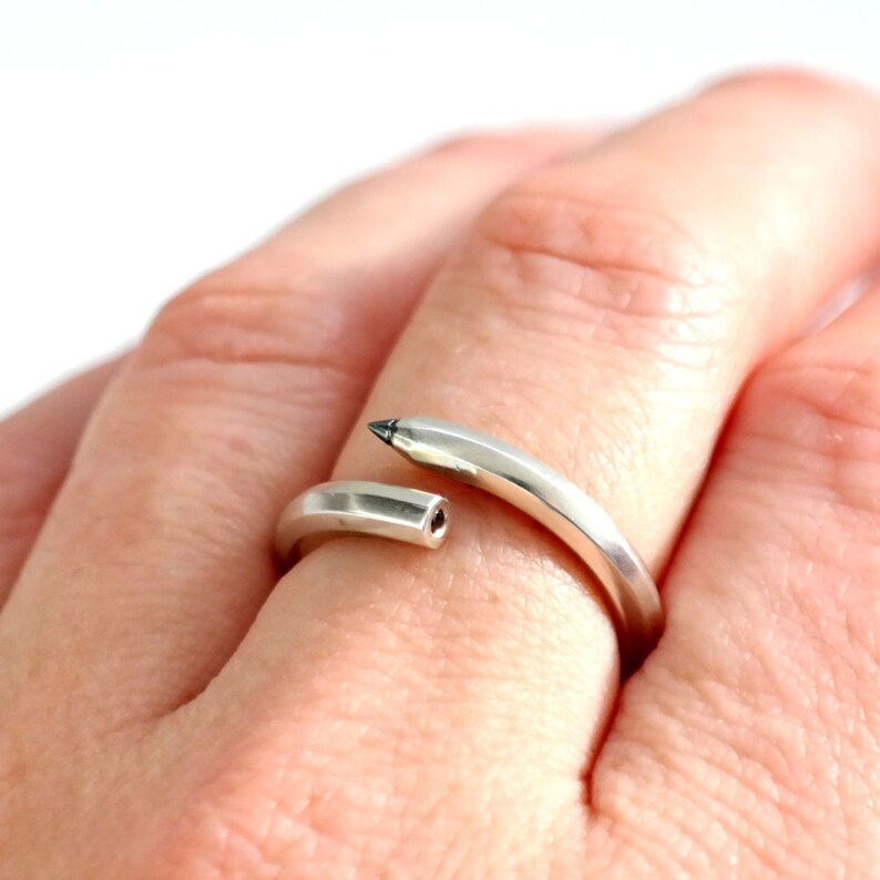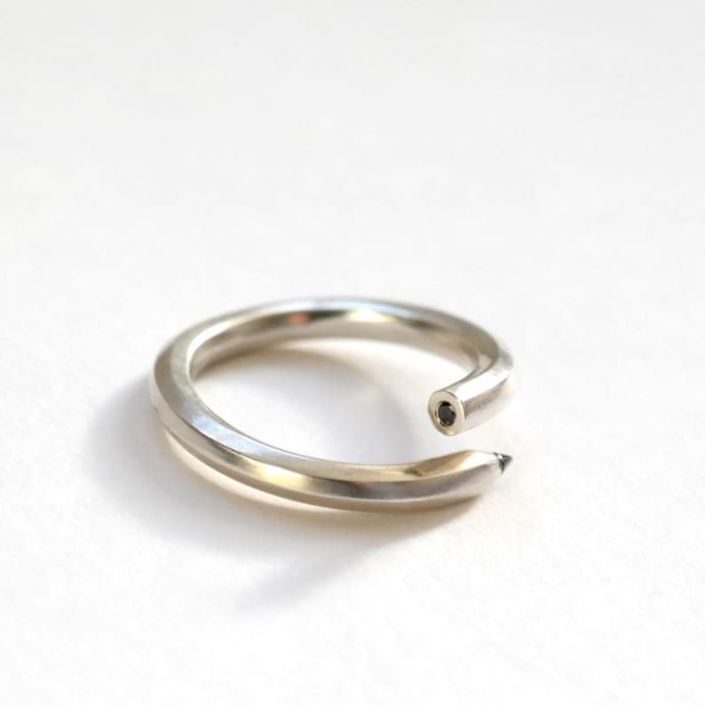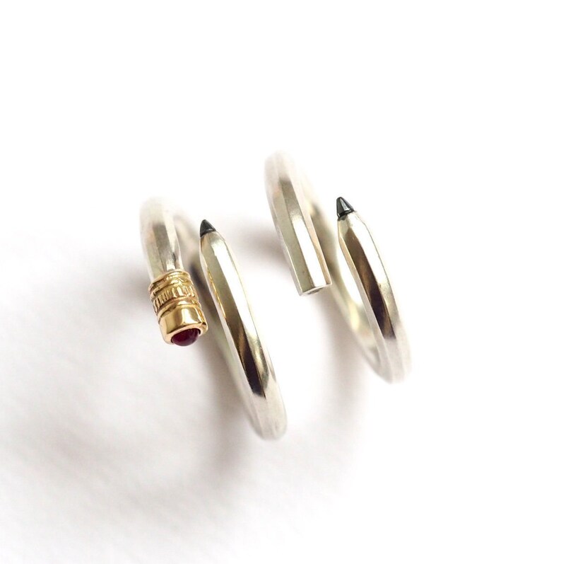 ②③.铅笔戒指;可爱别致简约,文具爱好者的绝佳礼物;英国手艺人SarahMeredith;采用回收纯银手工制作,边缘略呈六角形,笔尖呈黑色,铅笔末端饰有明亮式切割的黑色钻石(亦有9克拉金&红宝石的”橡皮头”版等等);尺码定制(20180716)