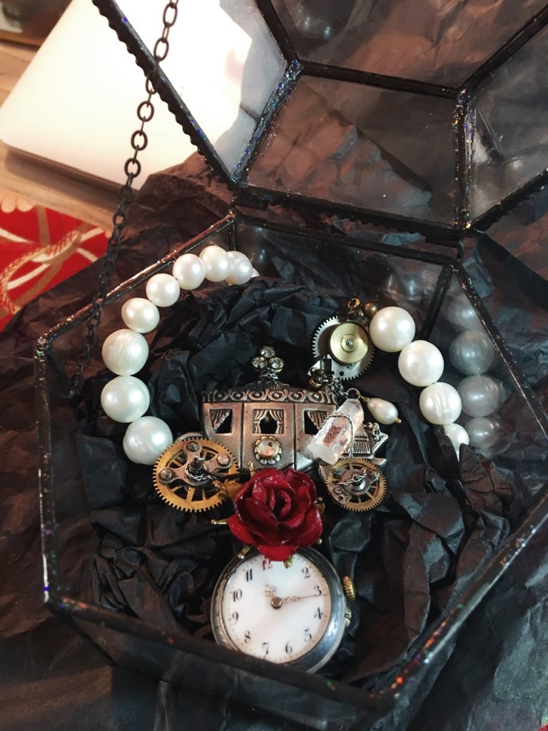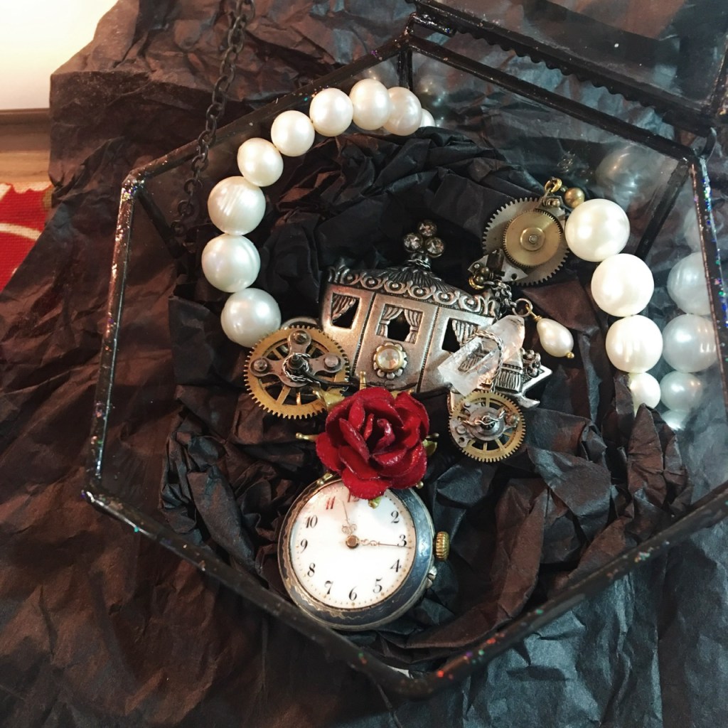 ③.「南瓜马车」项链|维多利亚蒸汽朋克系列;灵感来自童话《灰姑娘》(Cinderella);稀有古董鎏金雕花机械表盘/镀银美制黄铜印章/古董钟表零件/纸玫瑰/淡水珍珠/白水晶原石/钛钢链等;孤独品(20160715)