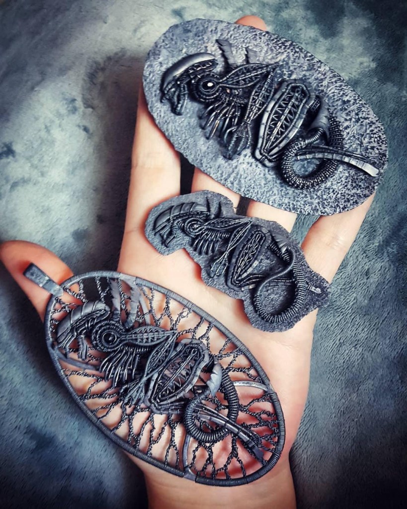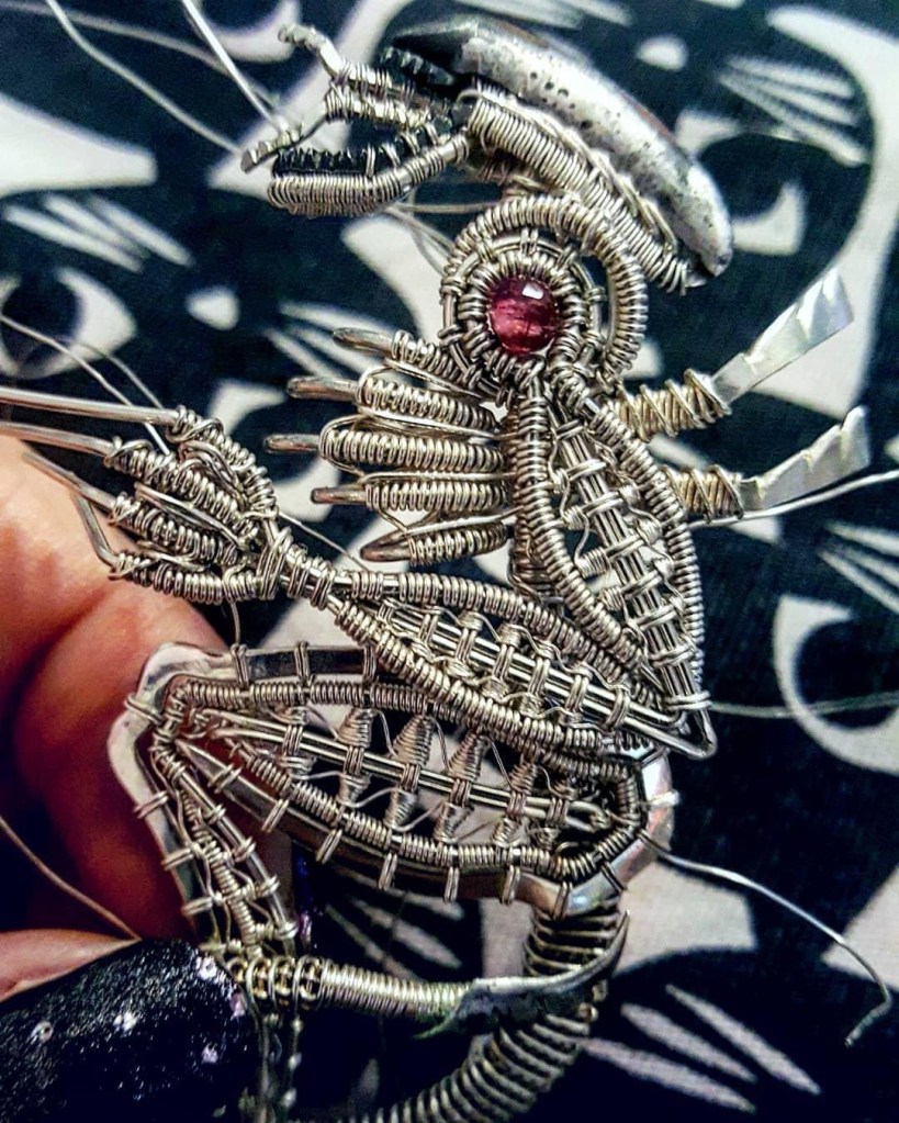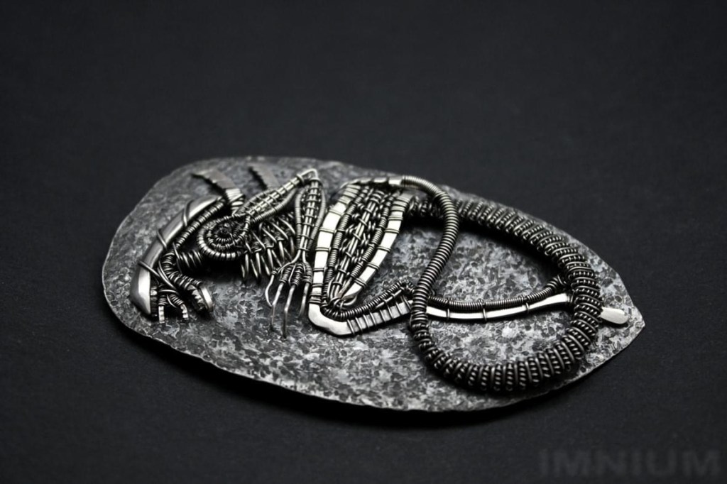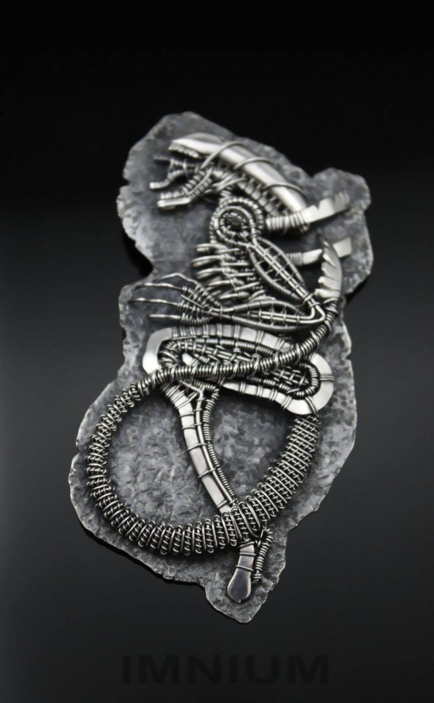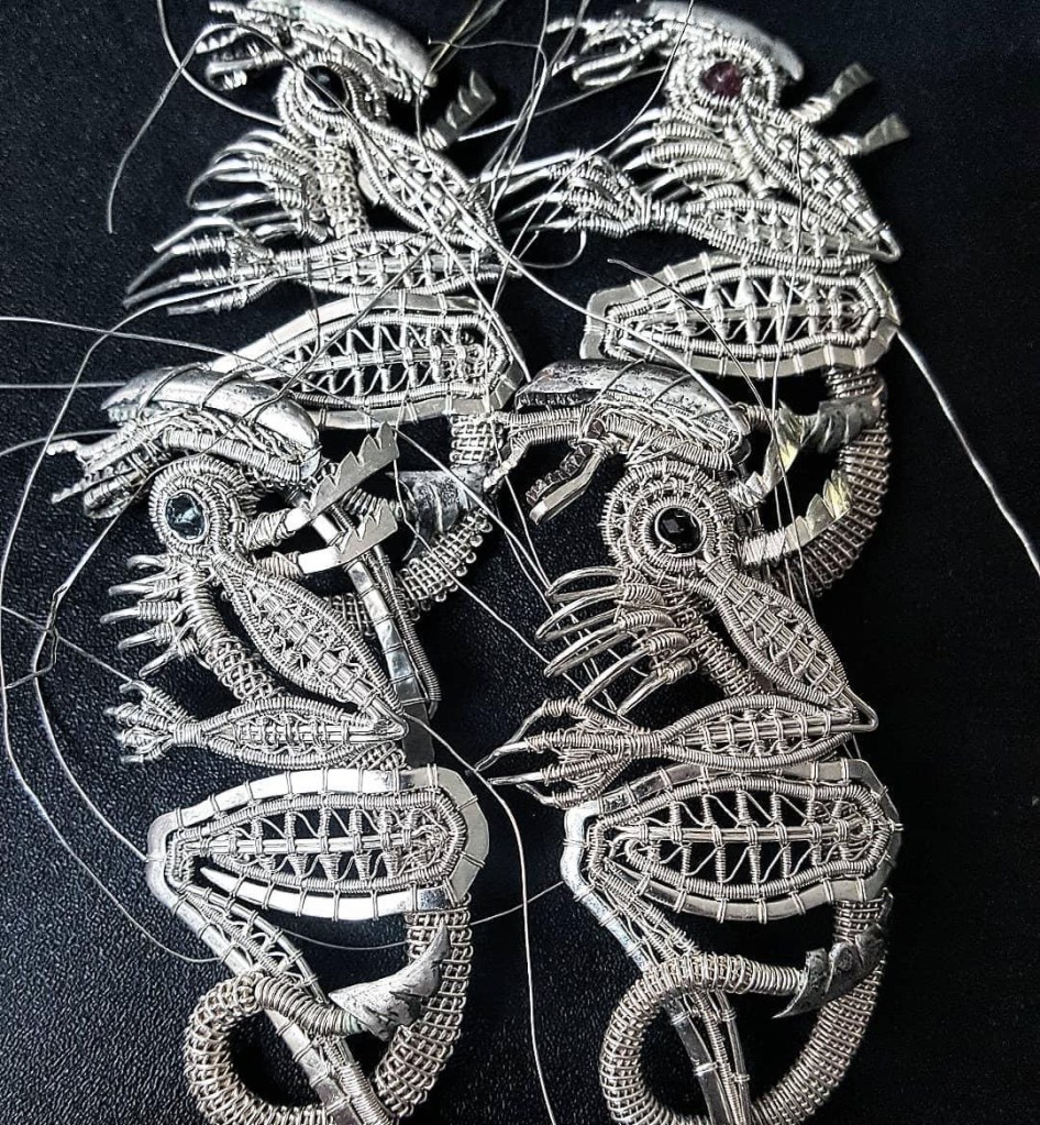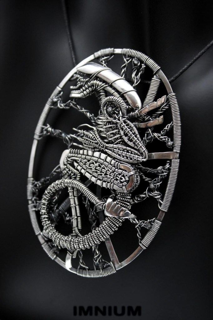 「异形」生物机械·野兽派·项坠项链;Croatia克罗地亚手艺人IvonaPšak的机械美学之纯银金属系列;纯银/宝石等;纯手工缠绕,强大的大工业机械猛兽范,致敬异形创造者H.R.Giger的超现实主义可佩戴艺术品。早在2012年底-2013年中开始创作, 最初花了好多时间构思,头部需要焊接和各种打磨和编织,单独这部分就得花费至少30个小时的工作