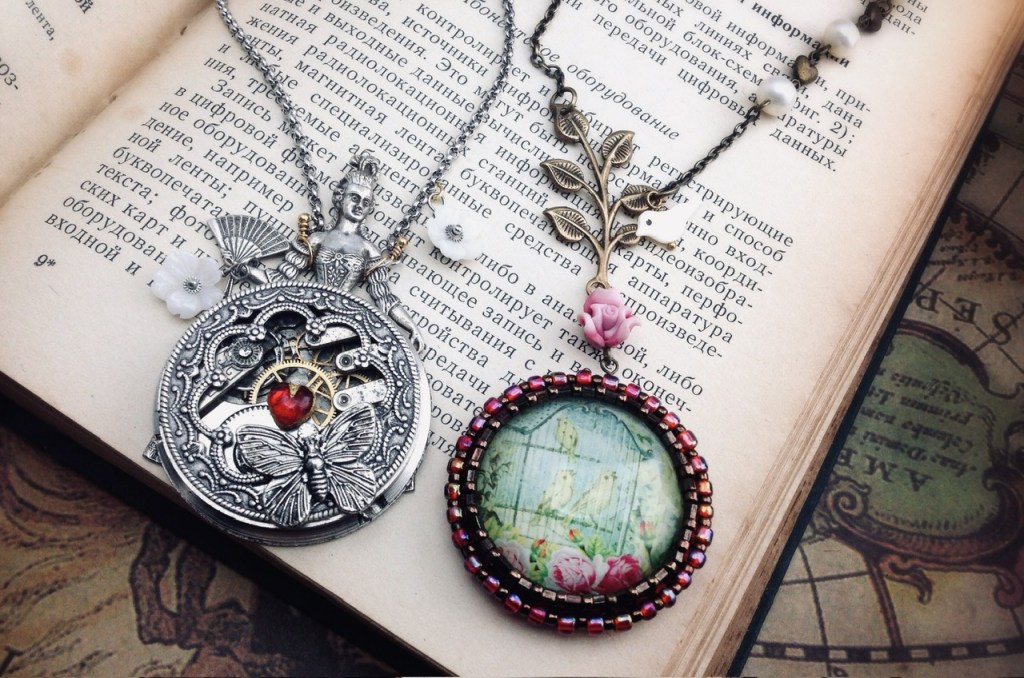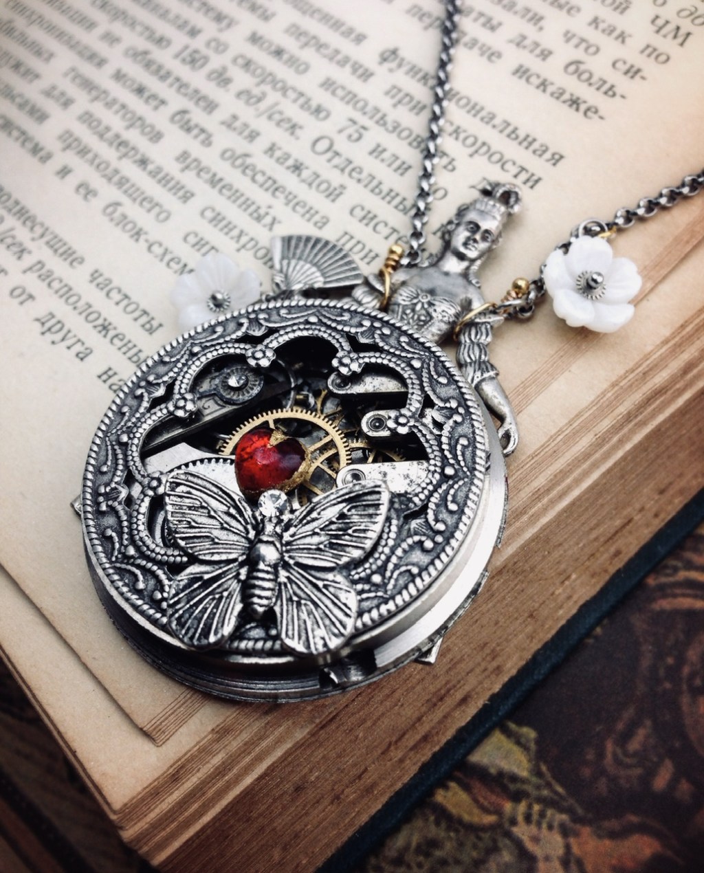 「维多利亚的魔法宝盒」项链|维多利亚蒸汽朋克系列;“魔法”在哪里?顺时针拨动中间的大齿轮数次,放手后相邻的三个小齿轮会快速旋转起来,持续数秒钟之长,同时发出沙沙的声音。看着精密的小齿轮飞速旋转,想像着它开启了时光的通道,带你去梦想的地方;有趣的,可惜视频和更多的写真均已丢失;古董机械表芯/镀银美制黄铜印章/中古西德琉璃红桃心宝石/金箔/贝壳花/钛钢链等;孤独品(20141111)
