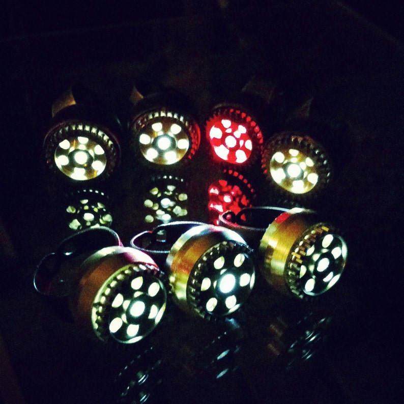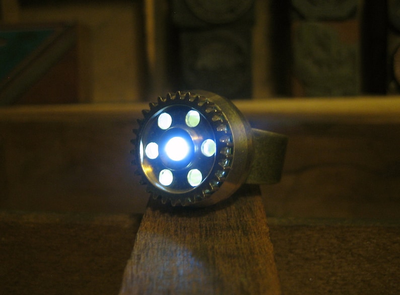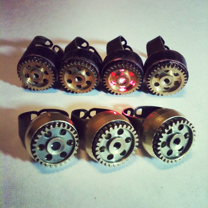 ①.发光手电筒·蒸汽朋克·戒指;适合喜欢蒸汽朋克且经常在黑暗中摸索并需要一丁点儿光线的人;美国手艺人JustinGeer;黄铜/红铜/齿轮/LED/树脂胶等;顺时针旋转戒指可打开LED灯,逆时针关闭,继续逆时针旋转会拧开电池室的盖子;使用 3V 锂电池,并附带一块备用电池;两个款式;绝版(2012-2016)/余少量现货