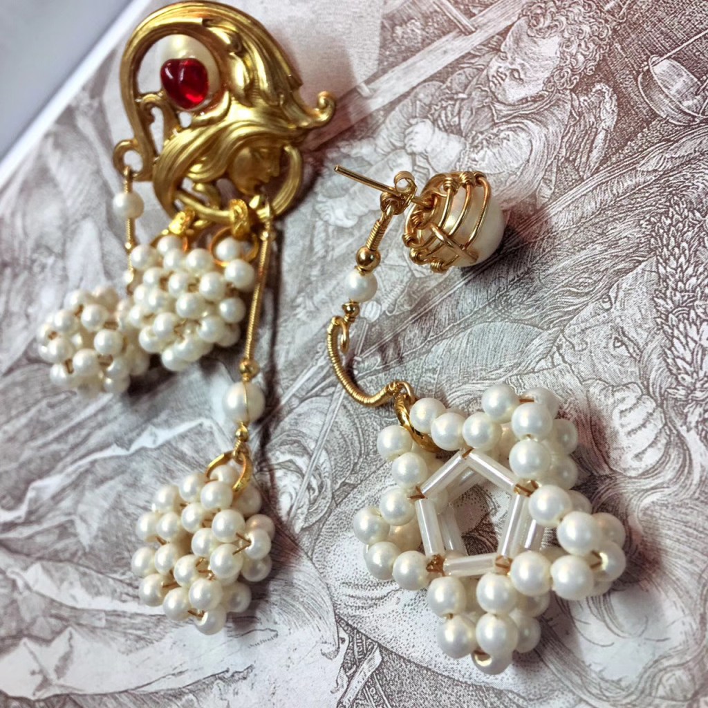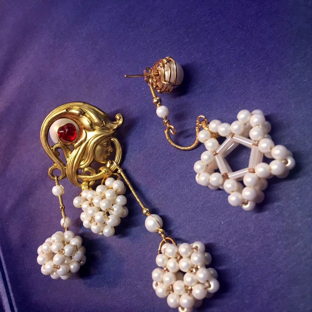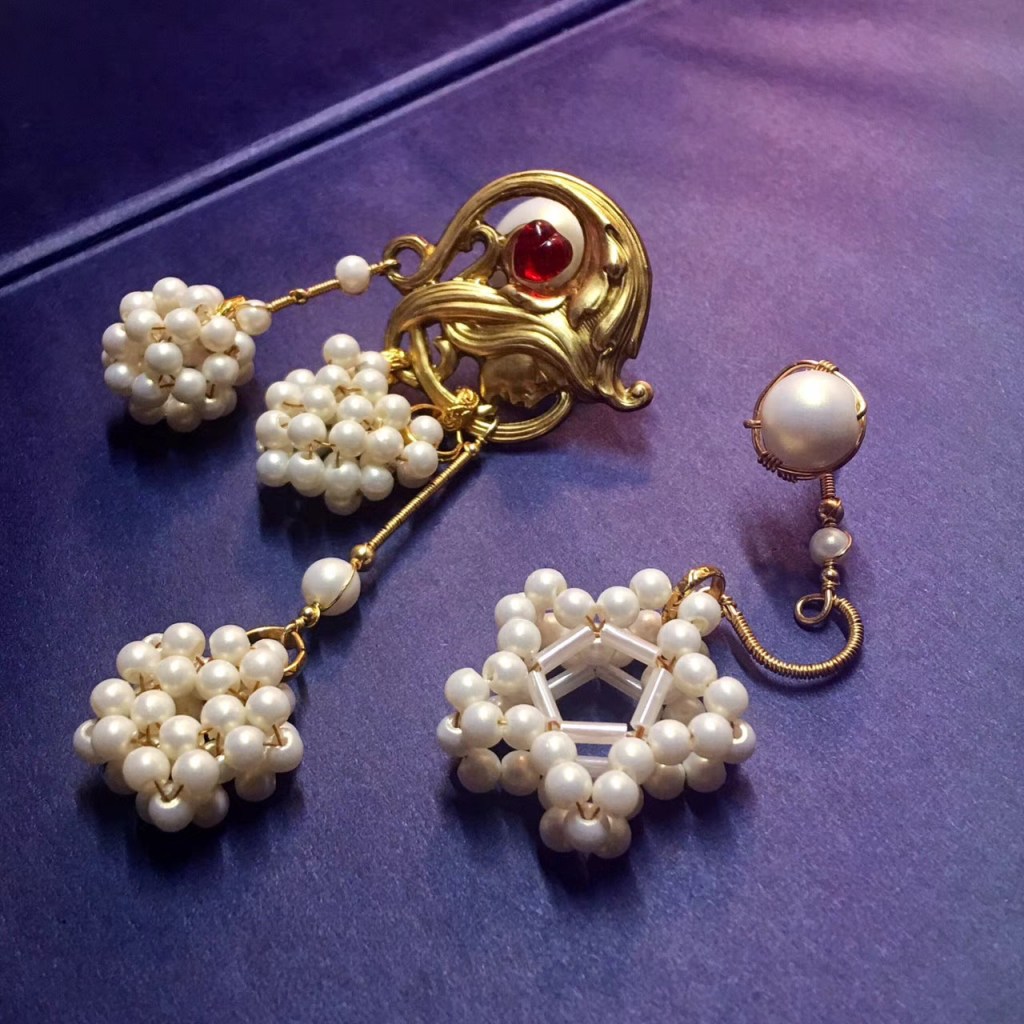 ①.「梦想家(遥远的)the (Distant) Dreamer 或白日梦想家Daydream Believer」耳环|樱果粒泡芙系列;美制14k包金线/美制镀金黄铜印章/中古西德红琉璃桃心宝石/韩制树脂珍珠等;孤独品(20170823)