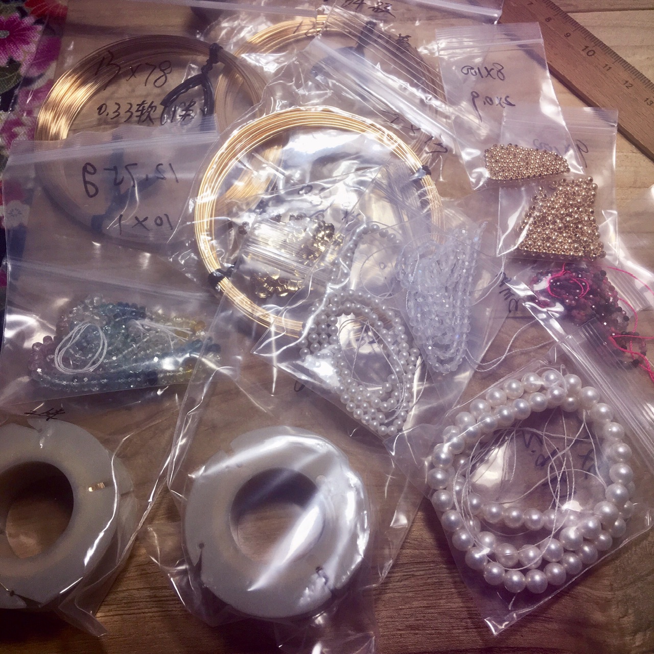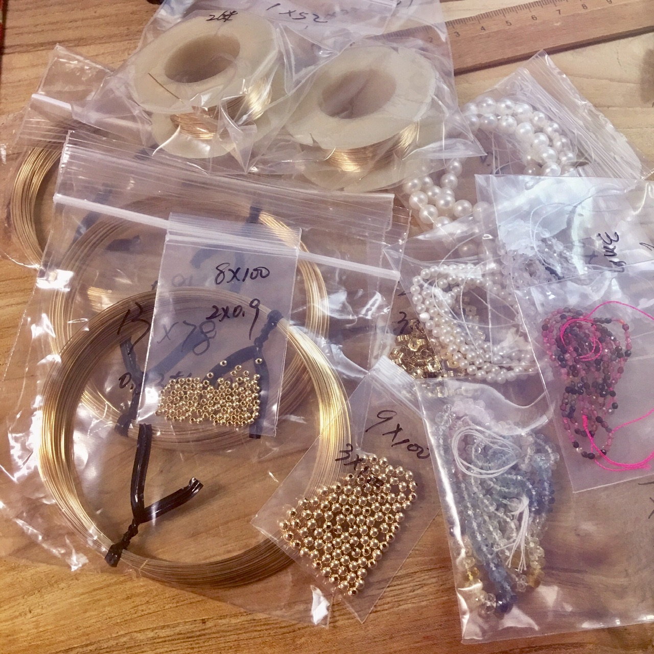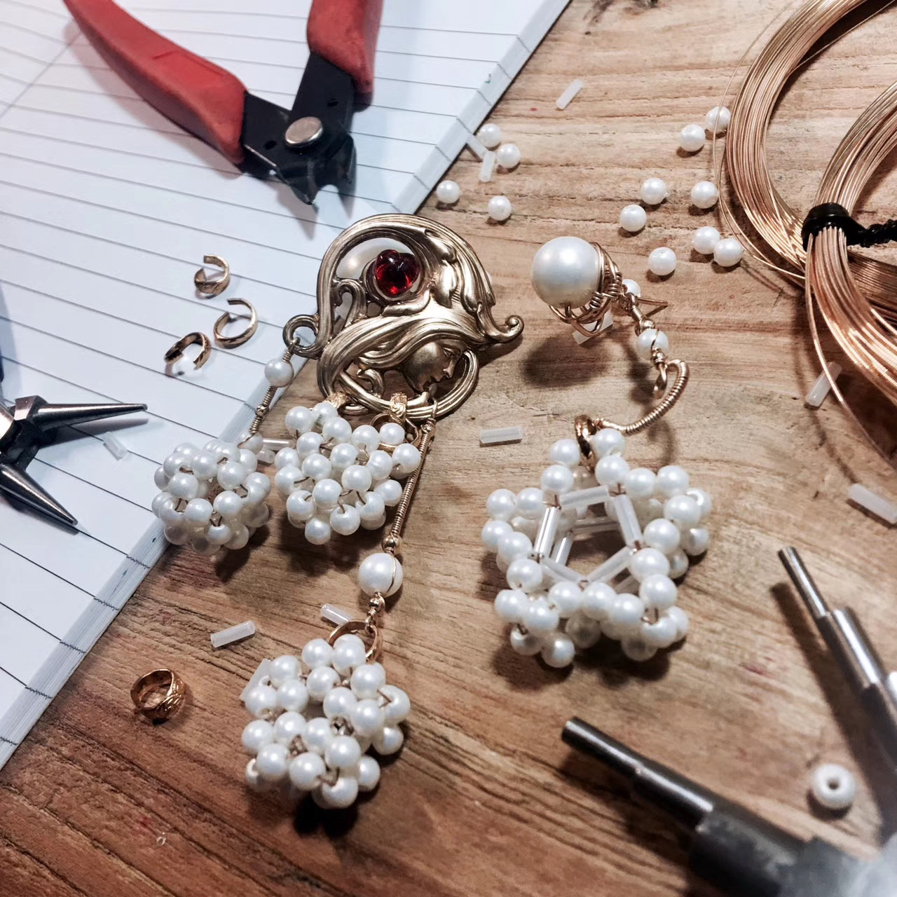 ①.「梦想家(遥远的)the (Distant) Dreamer 或白日梦想家Daydream Believer」耳环|樱果粒泡芙系列;美制14k包金线/美制镀金黄铜印章/中古西德红琉璃桃心宝石/韩制树脂珍珠等;孤独品(20170823)