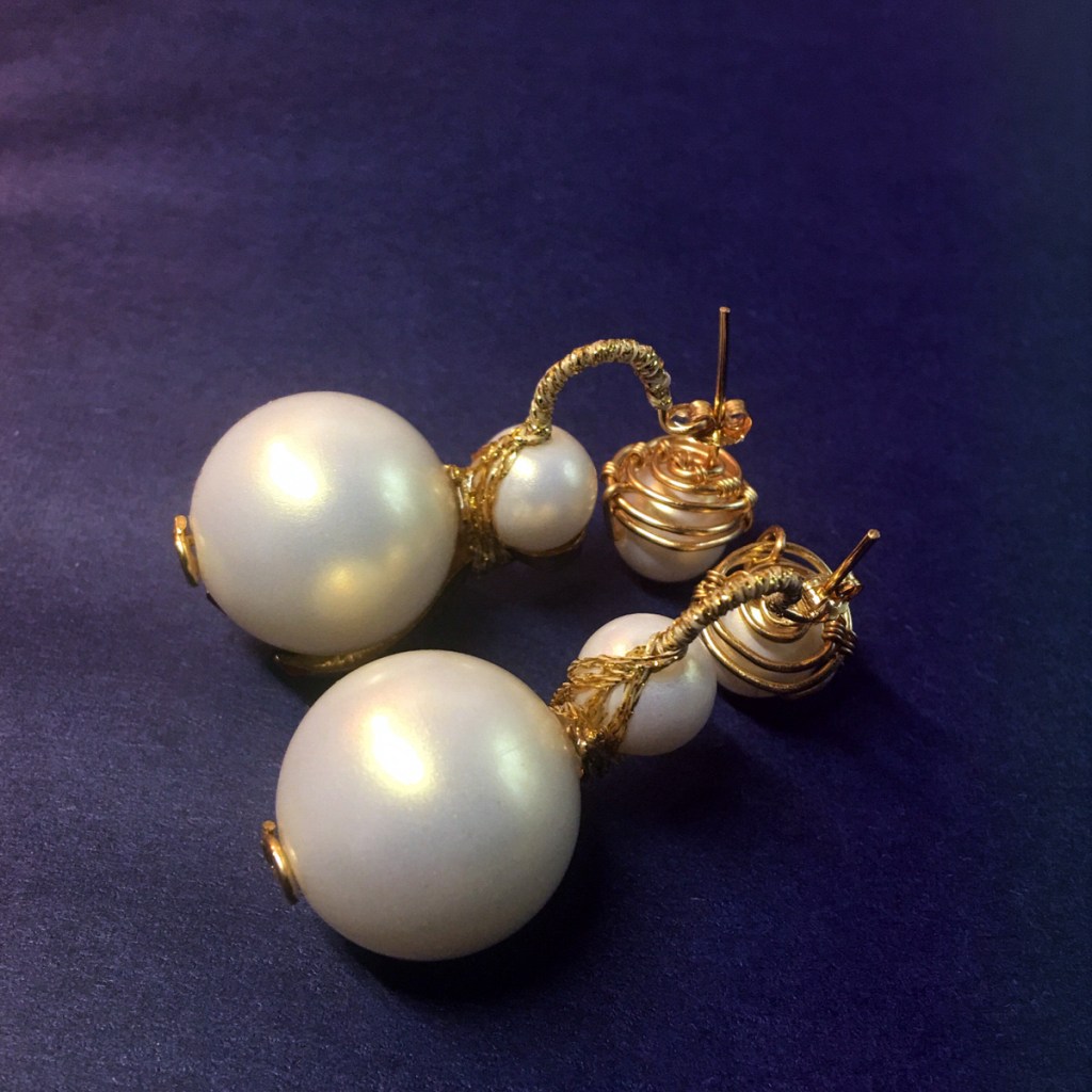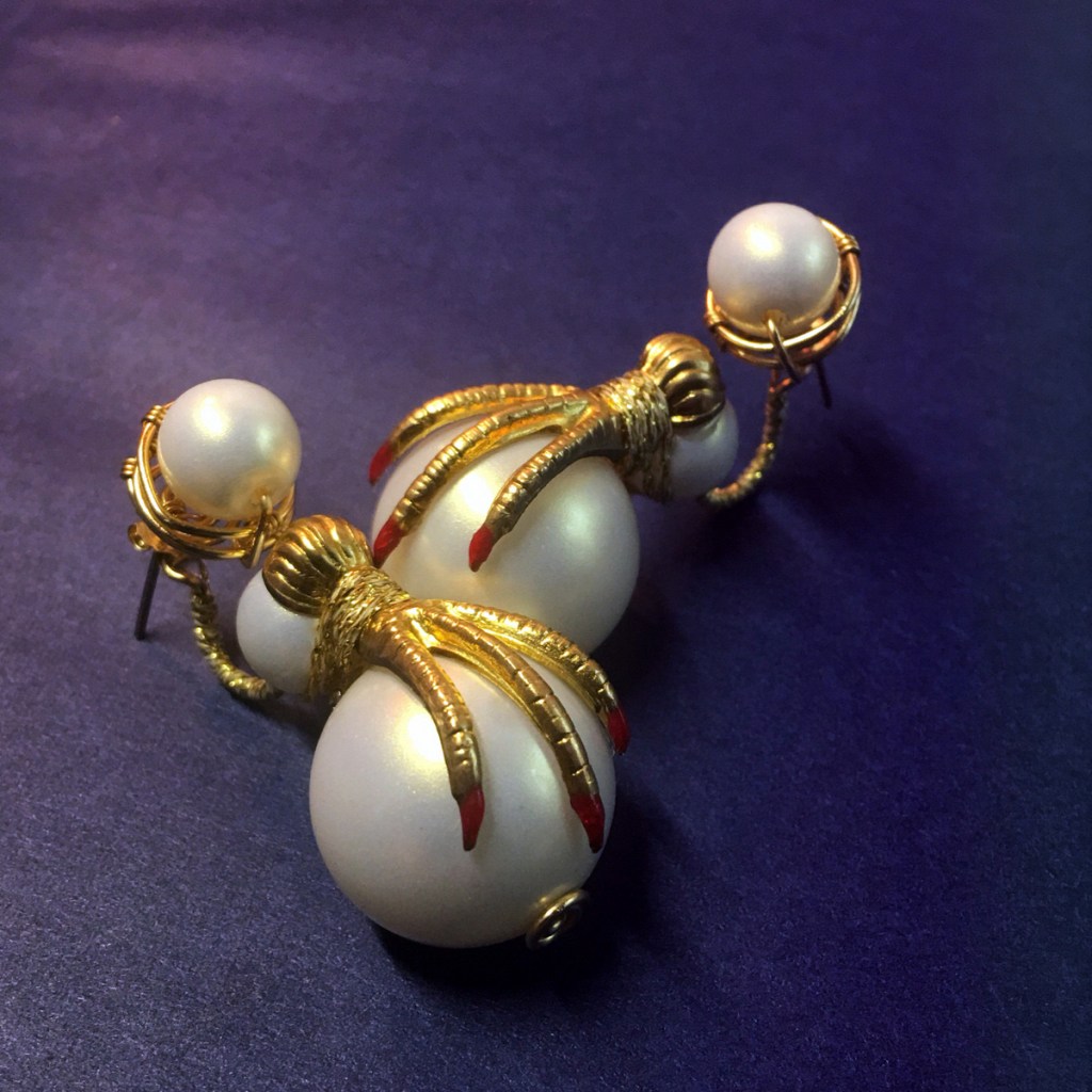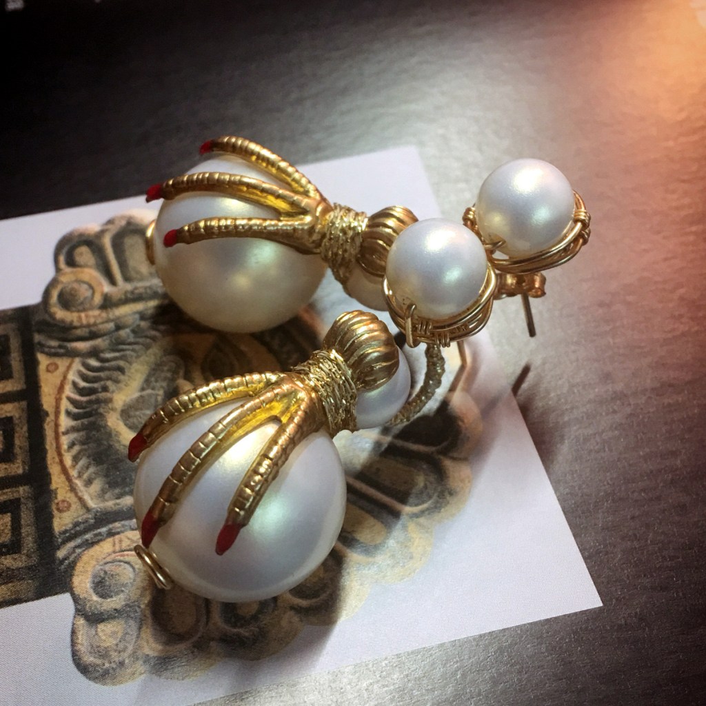 ③.「玄鸟•爪钉」耳环|樱果粒泡芙系列;美制14k包金线/美制镀金黄铜印章/韩制树脂珍珠等;约2×5厘米;孤独品(20170819)