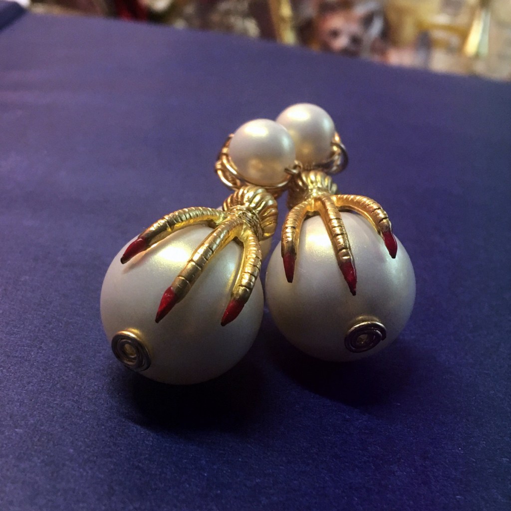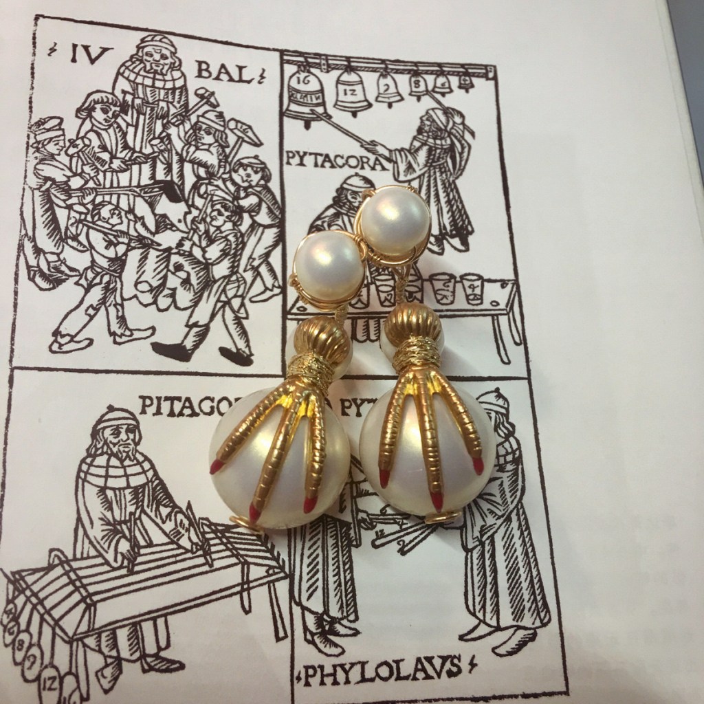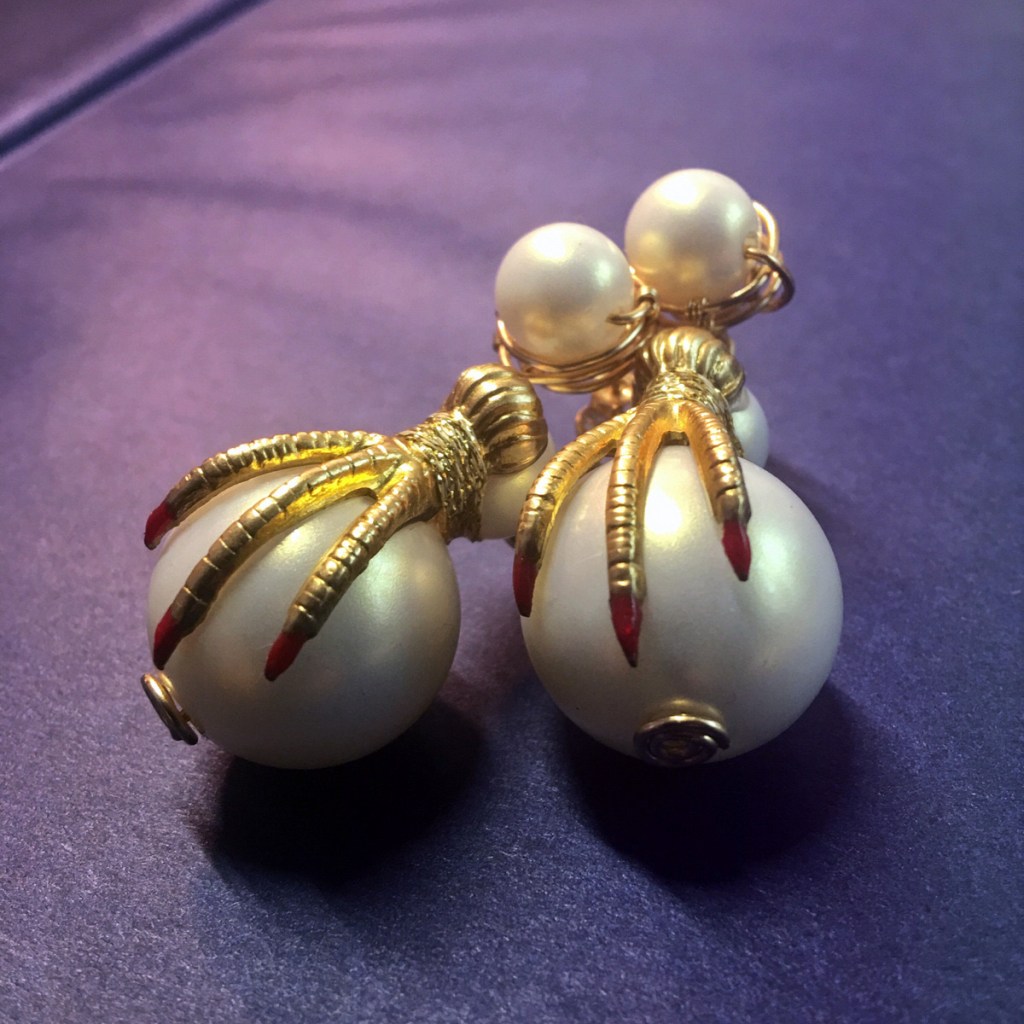 ③.「玄鸟•爪钉」耳环|樱果粒泡芙系列;美制14k包金线/美制镀金黄铜印章/韩制树脂珍珠等;约2×5厘米;孤独品(20170819)