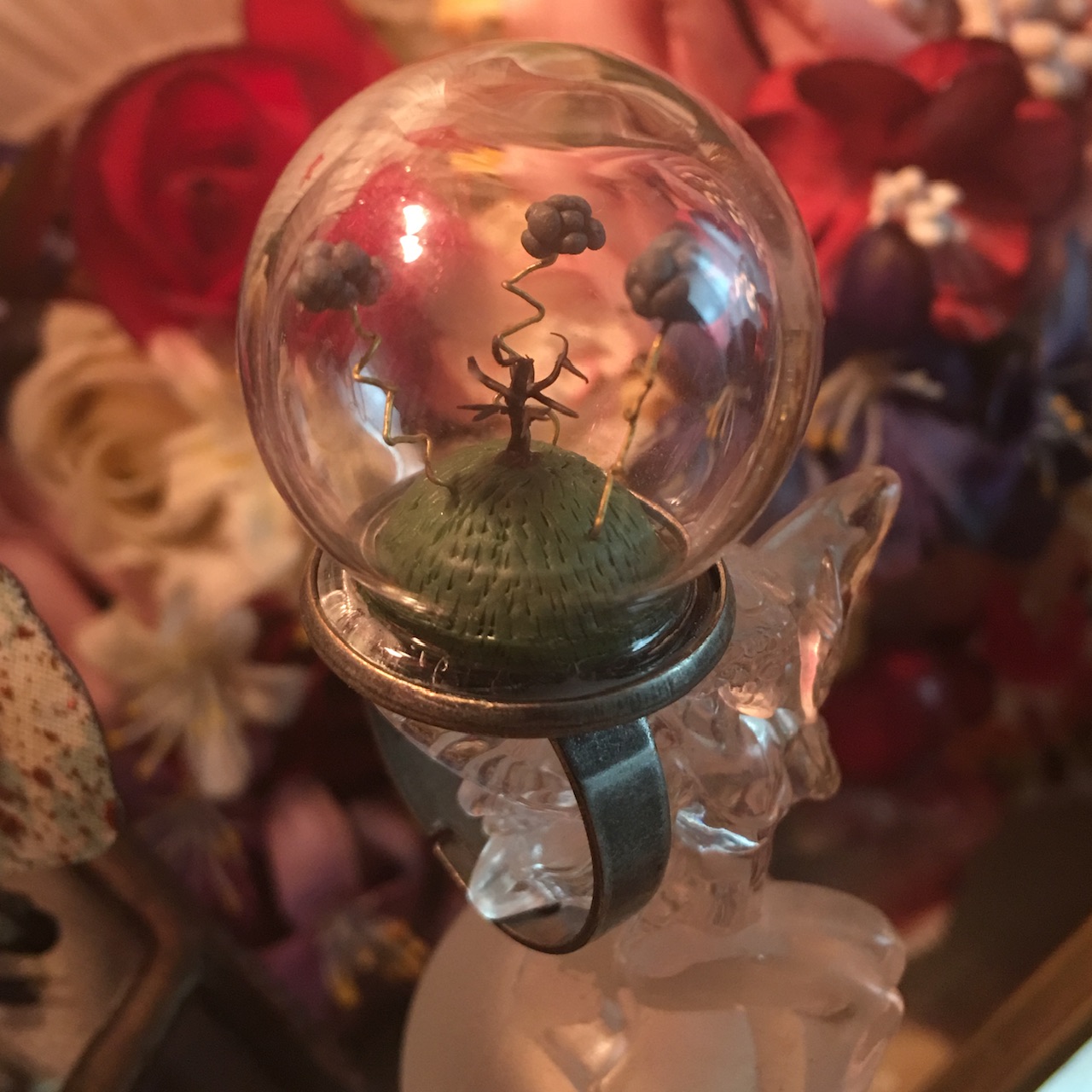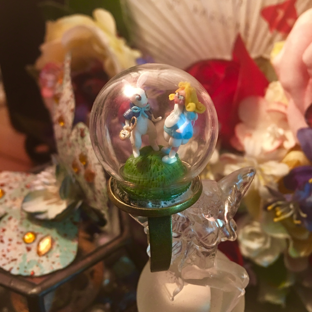 ①.「爱丽丝漫游记&闪电暴风雨」两款超迷你玻璃容器景观·戒指环;童话故事场景,一眼穿越童真世界(小时侯真的巨怕闪电,现在也怕…);定制于法国手艺人HoKiou;德国Fimo软陶/铜/玻璃等;纯手工软陶捏制,超多可爱细节;云朵仅3毫米高,枯树7毫米,玻璃圆顶约2.5厘米;手工吹制玻璃非常坚固不易碎,但也要爱护哦;绝版(20120417)