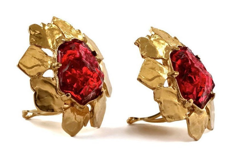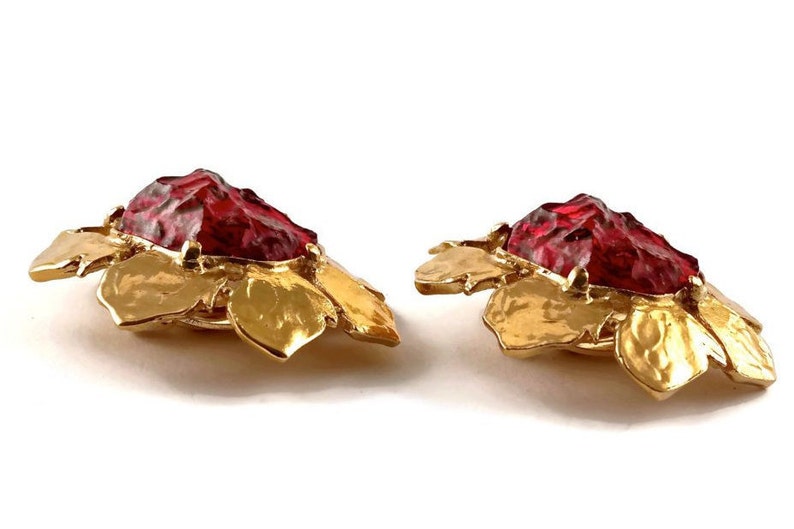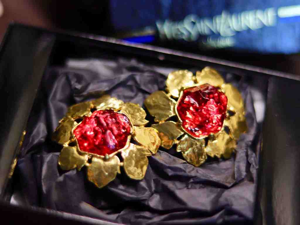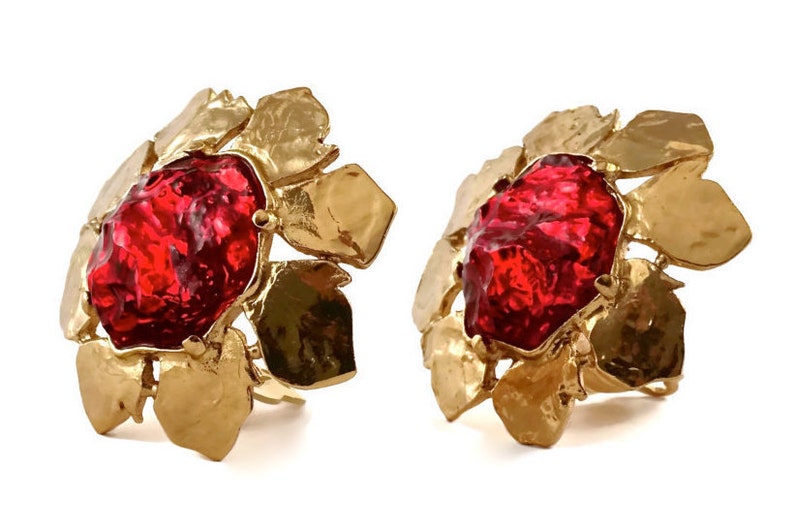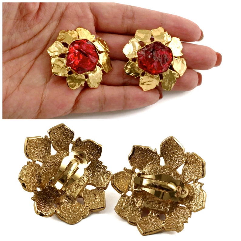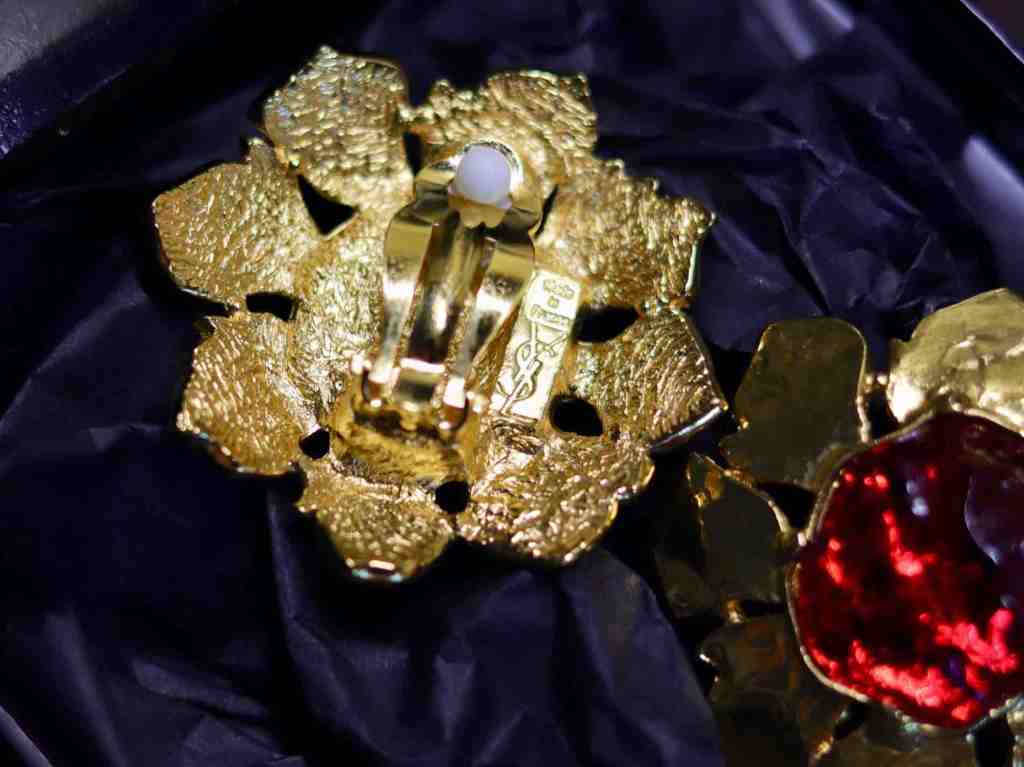 ③.不规则浇注树脂红宝石花·耳环;80年代YSL Yves Saint Laurent;树脂/镀金;直径4.44厘米;带原装盒;近乎全新(20190620)