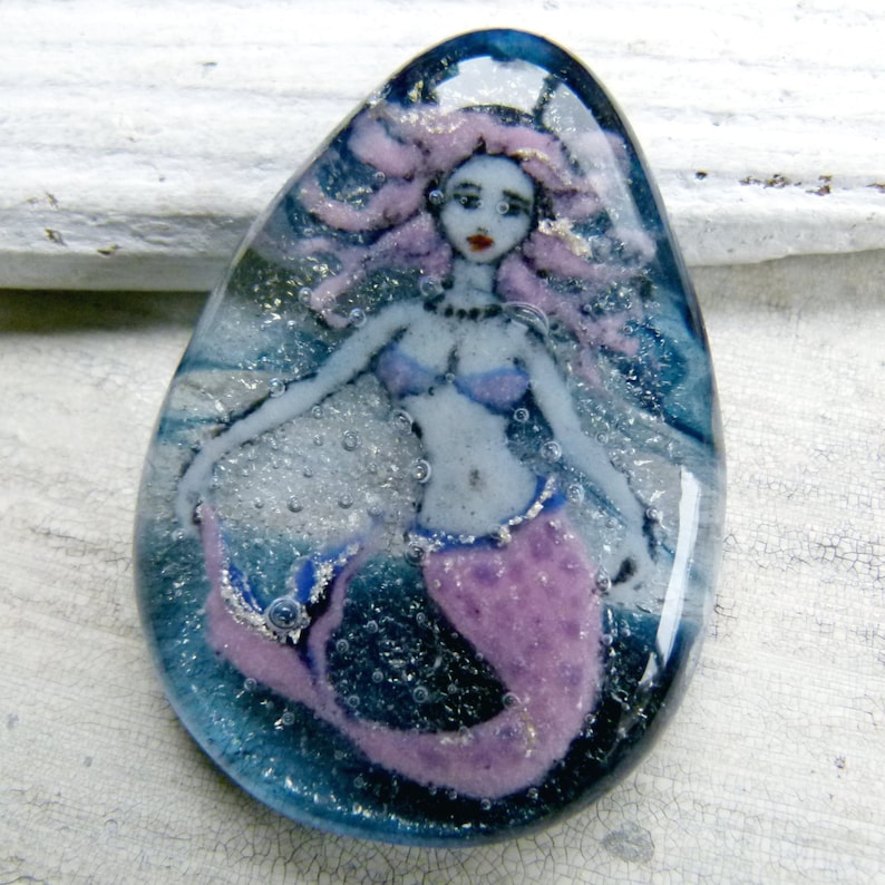 「美人鱼Mermaid」熔融玻璃艺术品·宝石块|海洋迷你景观系列;加拿大手艺人FannyDallaire;玻璃;尺寸约为 2 英寸 x 1 1/2 英寸;图像由多种极细的有色玻璃在近 1700 度的温度下熔合而成,每只形态等都略有差异;后经缓慢退火(玻璃的控制冷却)以确保其强度;绝版(20130513)/图丢失