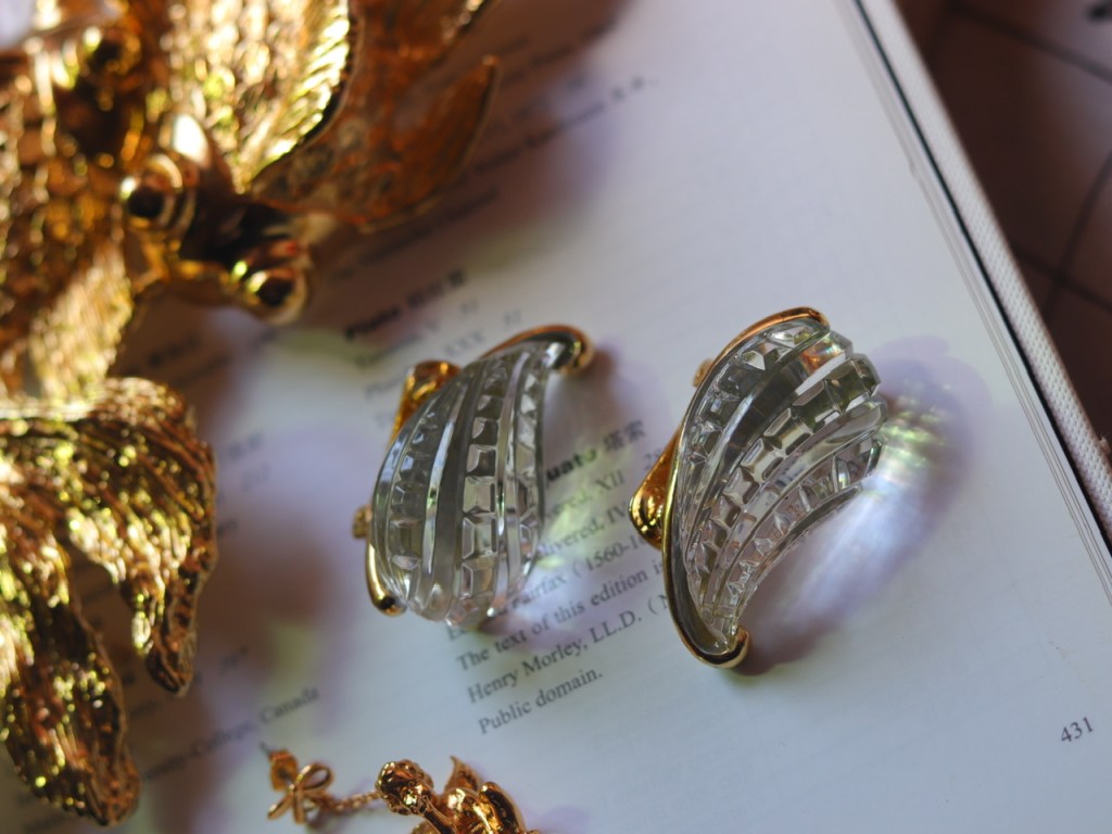 ②.火焰红橙有机花形彩宝复古80s耳环;以树脂宝石构成花瓣,呈现红与橙的层叠色调,表面带有细微凹凸质感;外围点缀橙色水钻。这类中小型金色耳饰体现当时对优雅日常佩戴首饰的追求:既有视觉亮点,凸显个性又不会过于张扬。约3.8cm,背面签名Cécile and Jeanne;镀金/浇铸树脂/人造水晶;美国|x8326