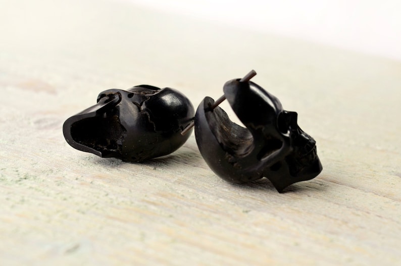 ①.骷髅头Skull牛角3D立体假耳扩耳环;西班牙手艺人手工雕刻;黑木+黑蜡+水牛角耳针;耳环很轻巧;部落风(2015-2018)/现货余2副