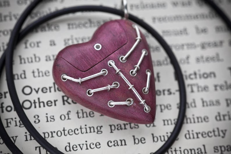紫心木心形USB项坠项链;英国手艺人RobinSmith;16GB的USB/ 回收的紫心木PurpleHeart/纯银/LED;高约 1.5 英寸,配有一条 18 英寸的橡胶项链;纯手工雕刻;维多利亚蒸汽朋克风;孤独品(20141217)/图丢失