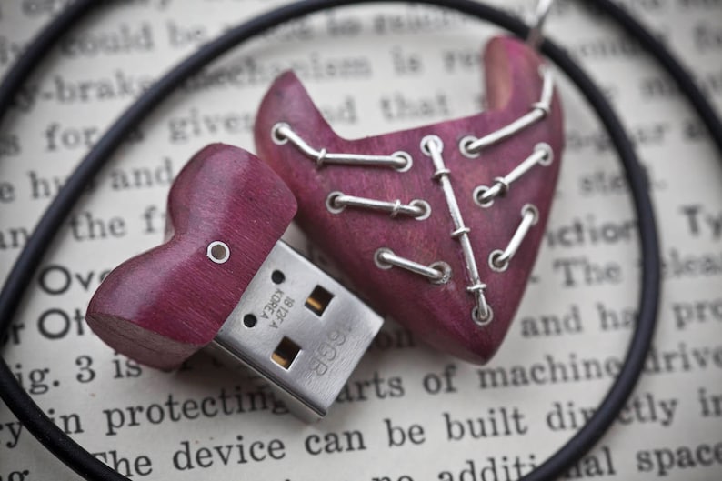 ③.紫心木心形USB项坠项链;英国手艺人RobinSmith;16GB的USB/ 回收的紫心木PurpleHeart/纯银/LED;高约 1.5 英寸,配有一条 18 英寸的橡胶项链;纯手工雕刻;维多利亚蒸汽朋克风;孤独品(20141217)