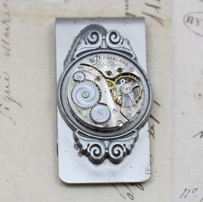 维多利亚蒸汽朋克风·钱夹;美国手艺人ElizabethLatham;中古维多利亚卷轴钱夹/古董机械怀表机芯; 2 英寸 x 1 英寸;划痕和氧化赋予其时光的美好记忆;孤独品(20130819)/图丢失