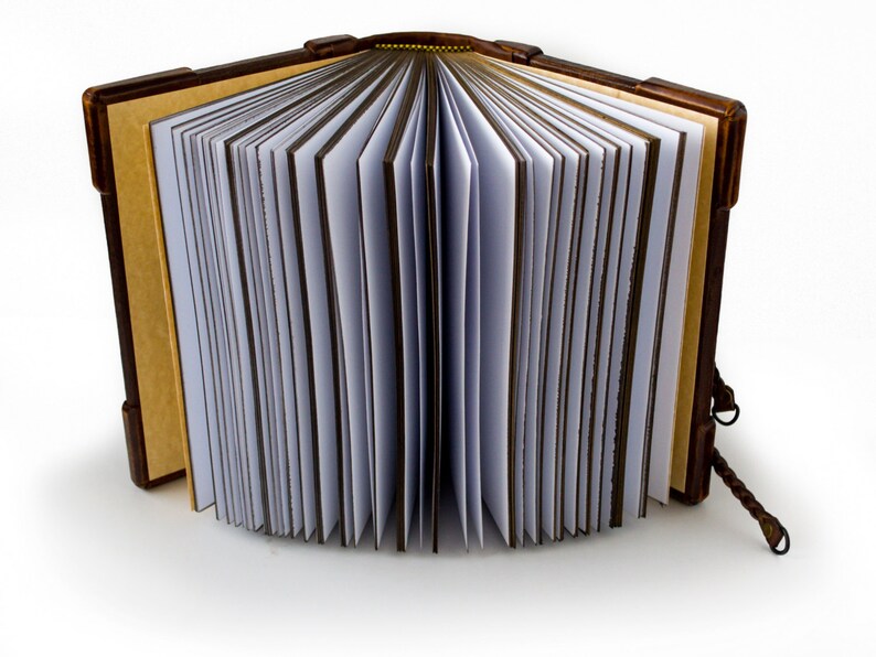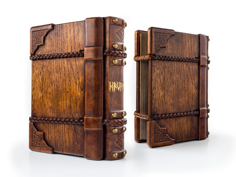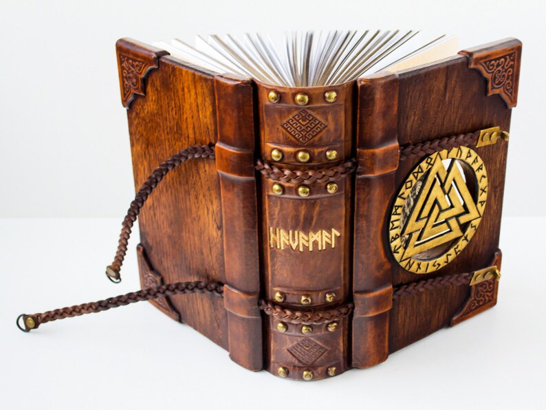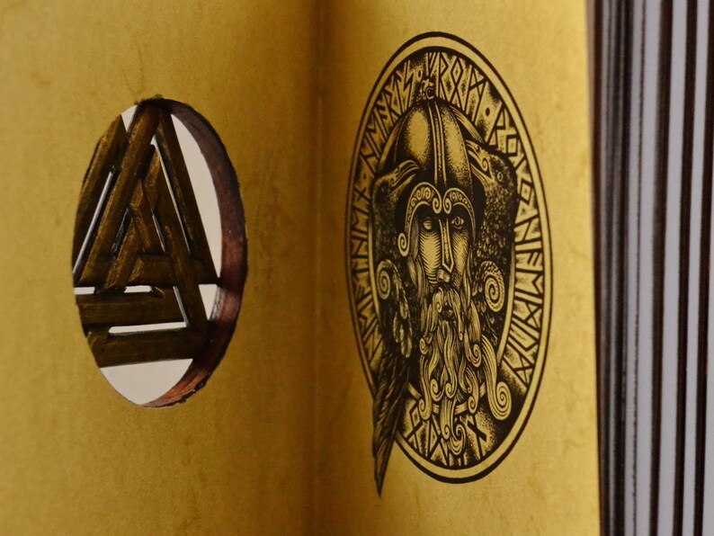 日记本尺寸为7 x 9英寸,厚度为2.5英寸。书芯采用80gsm无酸、干净的白纸制成,约有280 片书叶(560 页)。橡木板手工调色,部分用皮革装订。中央细节,双面Valknut符号由厚皮革手工雕刻而成,镀金且做旧。24个符文,分为3组,每组8个,代表北欧诸神和女神。中间是奥丁的Valknut。书脊上的书名含义为:“至高者的话语”。