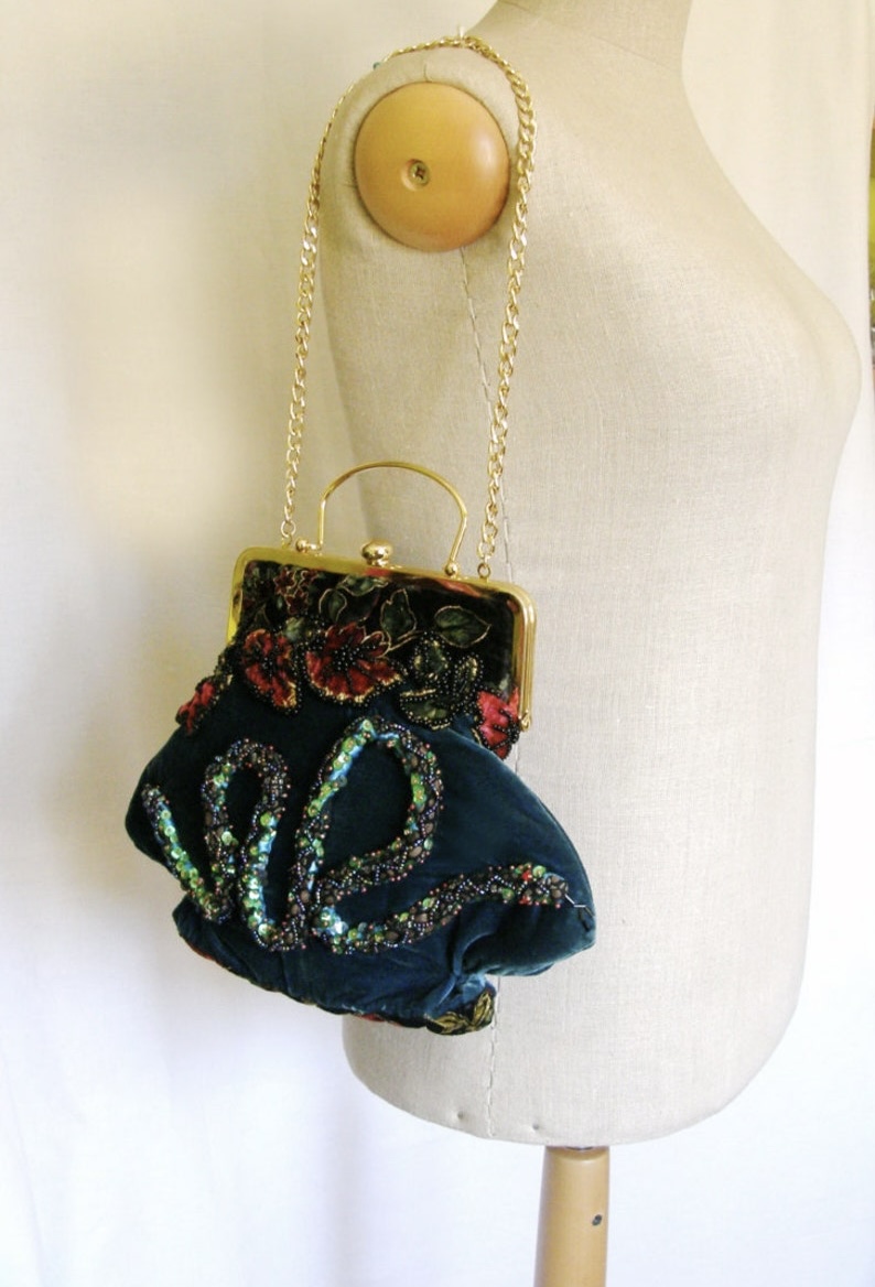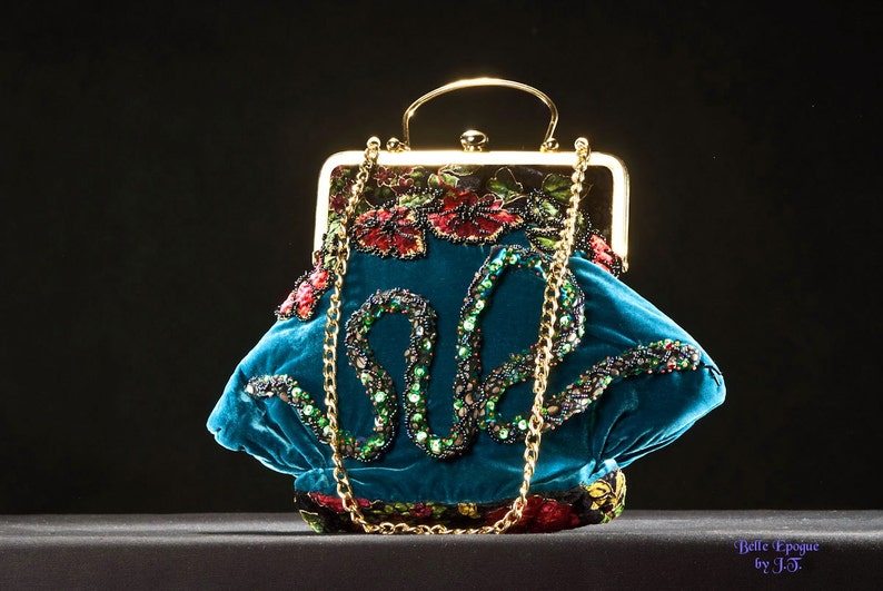 「大蛇」手工刺绣口金包;波兰手艺人JolantaTrzcińska;天鹅绒/黄铜/亮片/珠子等;采用深蓝绿色天鹅绒制成, 带金色手柄的装饰性口金框闭合, 带门襟的衬里,包包正面饰有手工制作的细节——大蛇和花,绣有亮片和珠饰; 尺寸30X24X6cm;链长65cm;孤独品(20141015)/图丢失